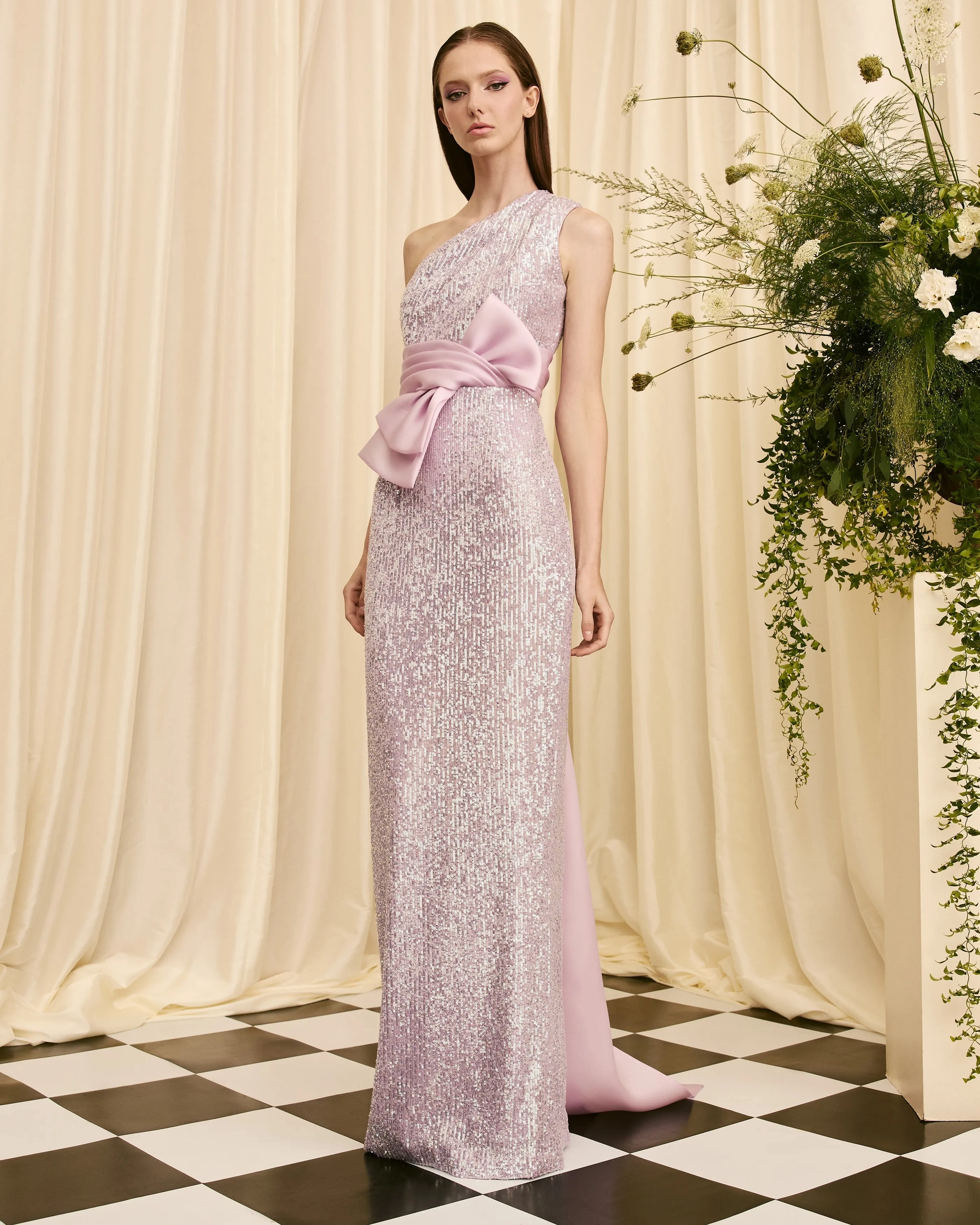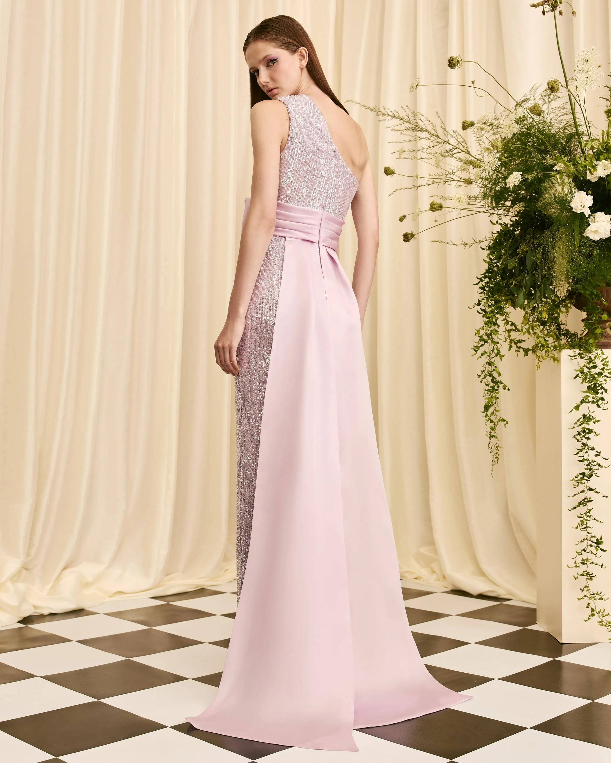 one shoulder gown draped bodice asymmetrical contrast bow detachable train