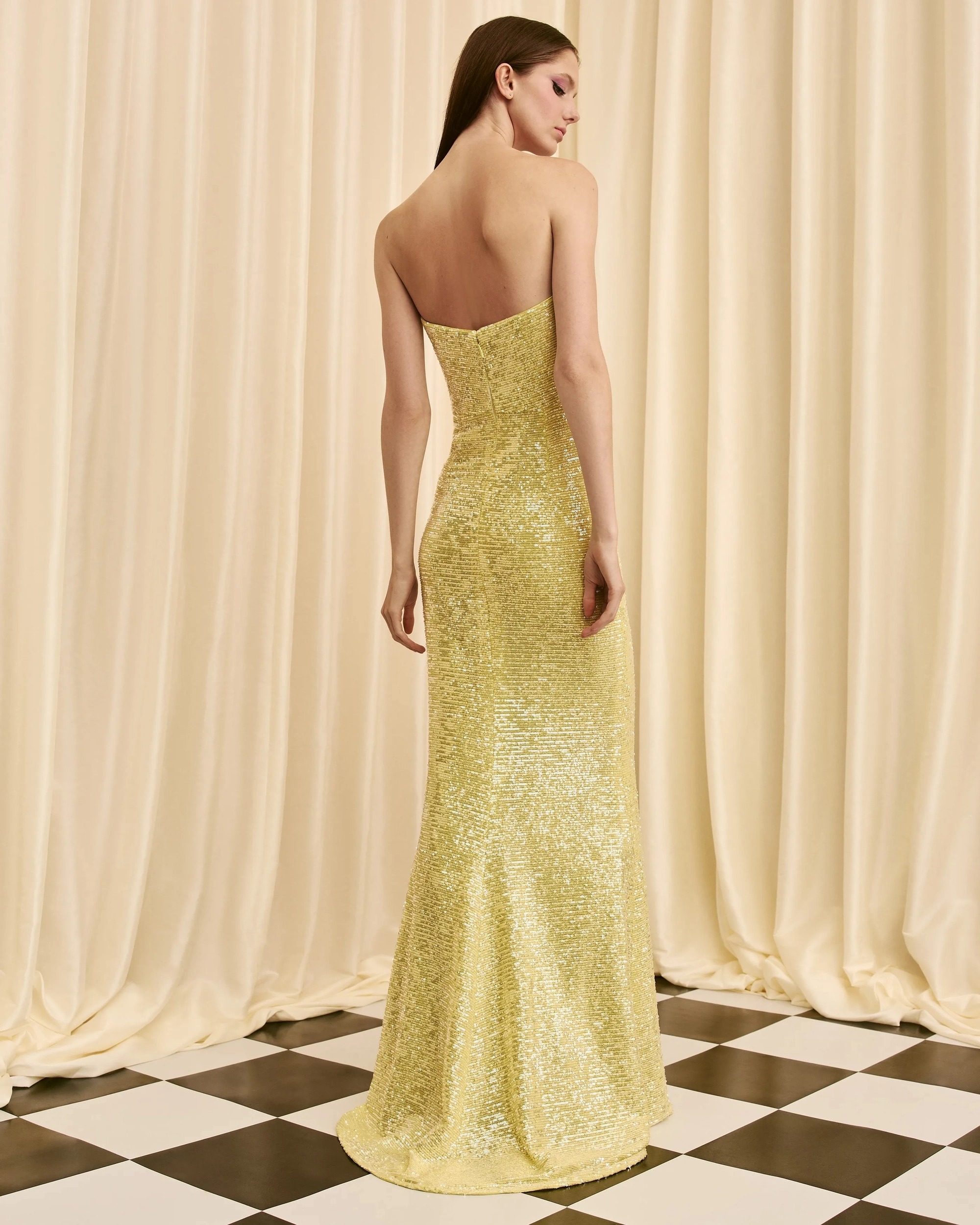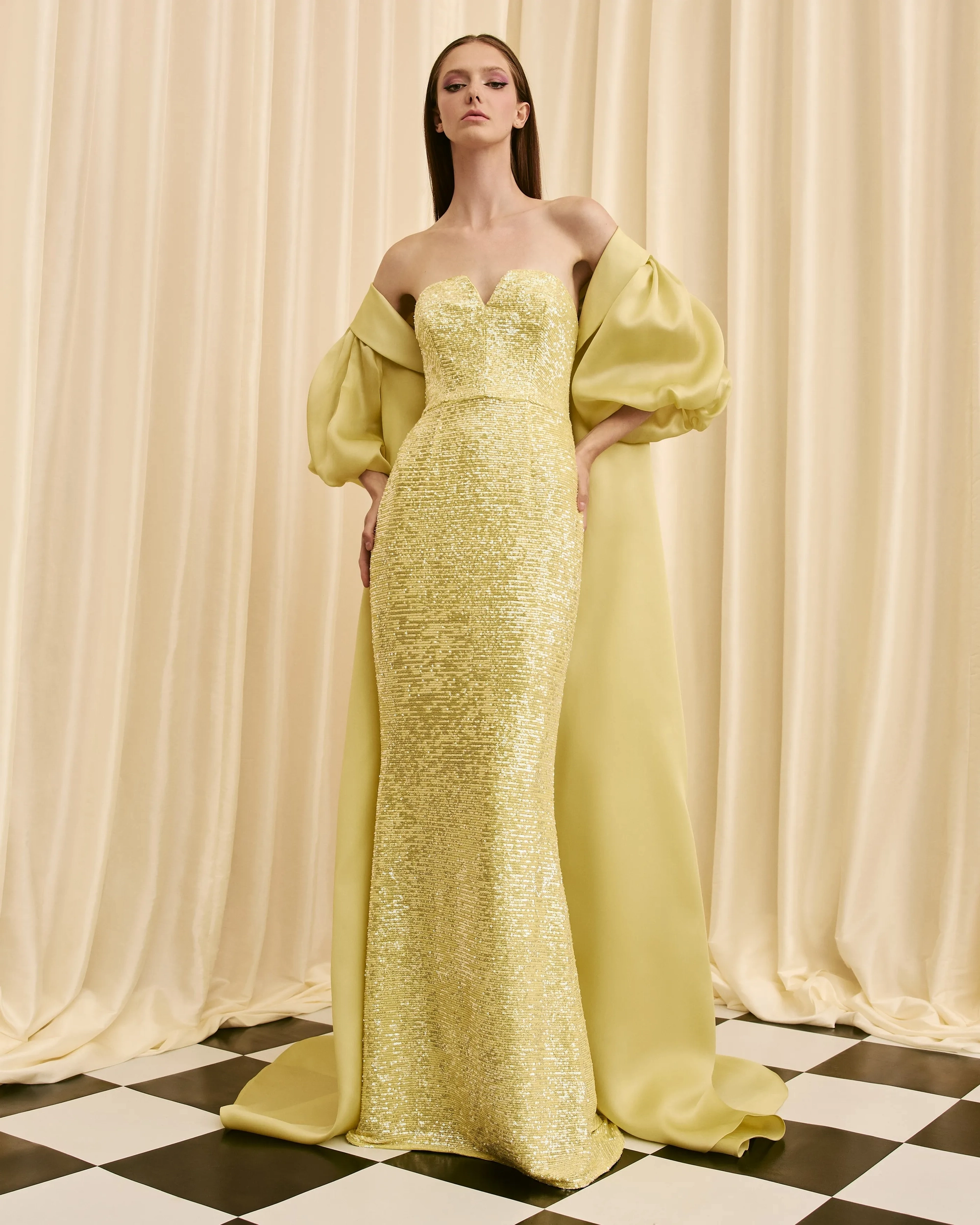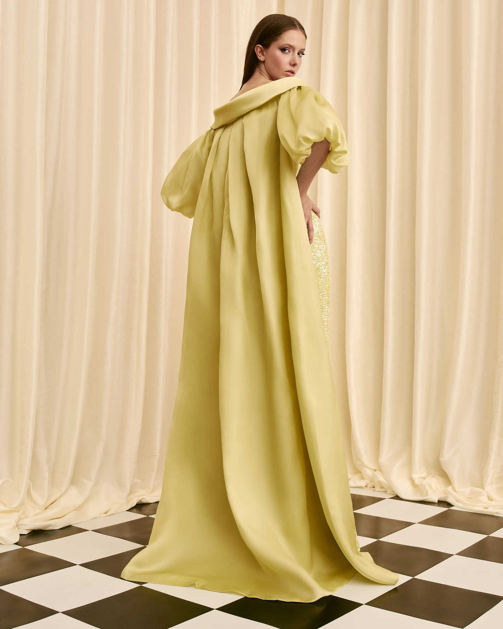 strapless gown deep V neckline contrast Opera coat puff sleeves back pleat detail