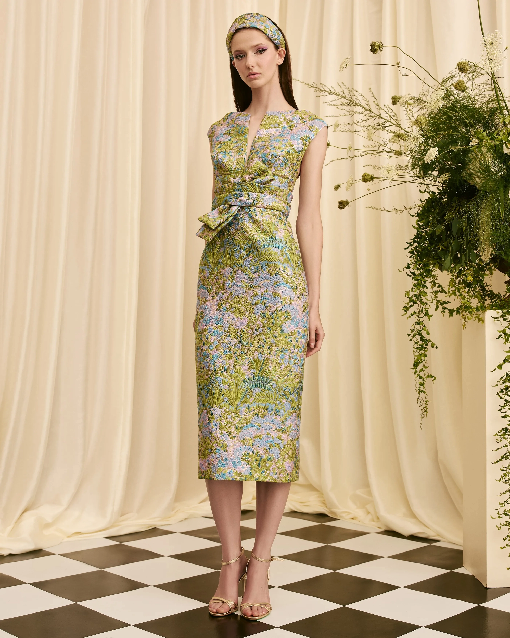 sleeveless midi dress deep V-neckline wide waistband with bow