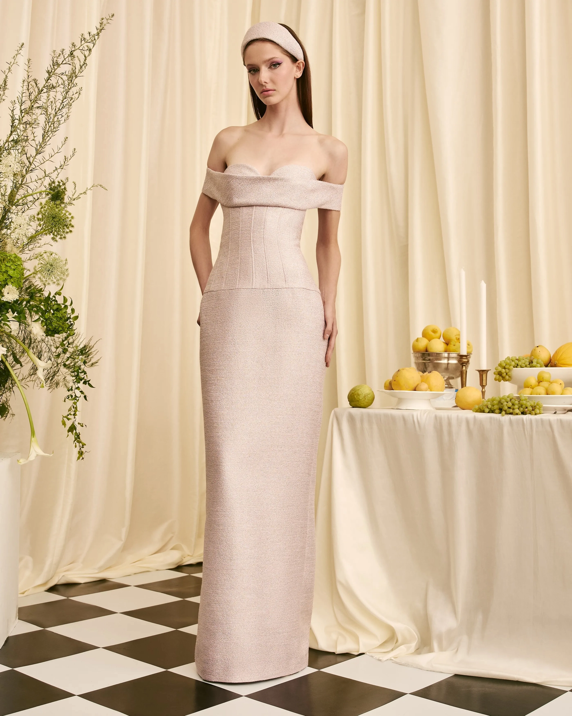 off the shoulder gown bodice collar band corset seam detail dropped waist