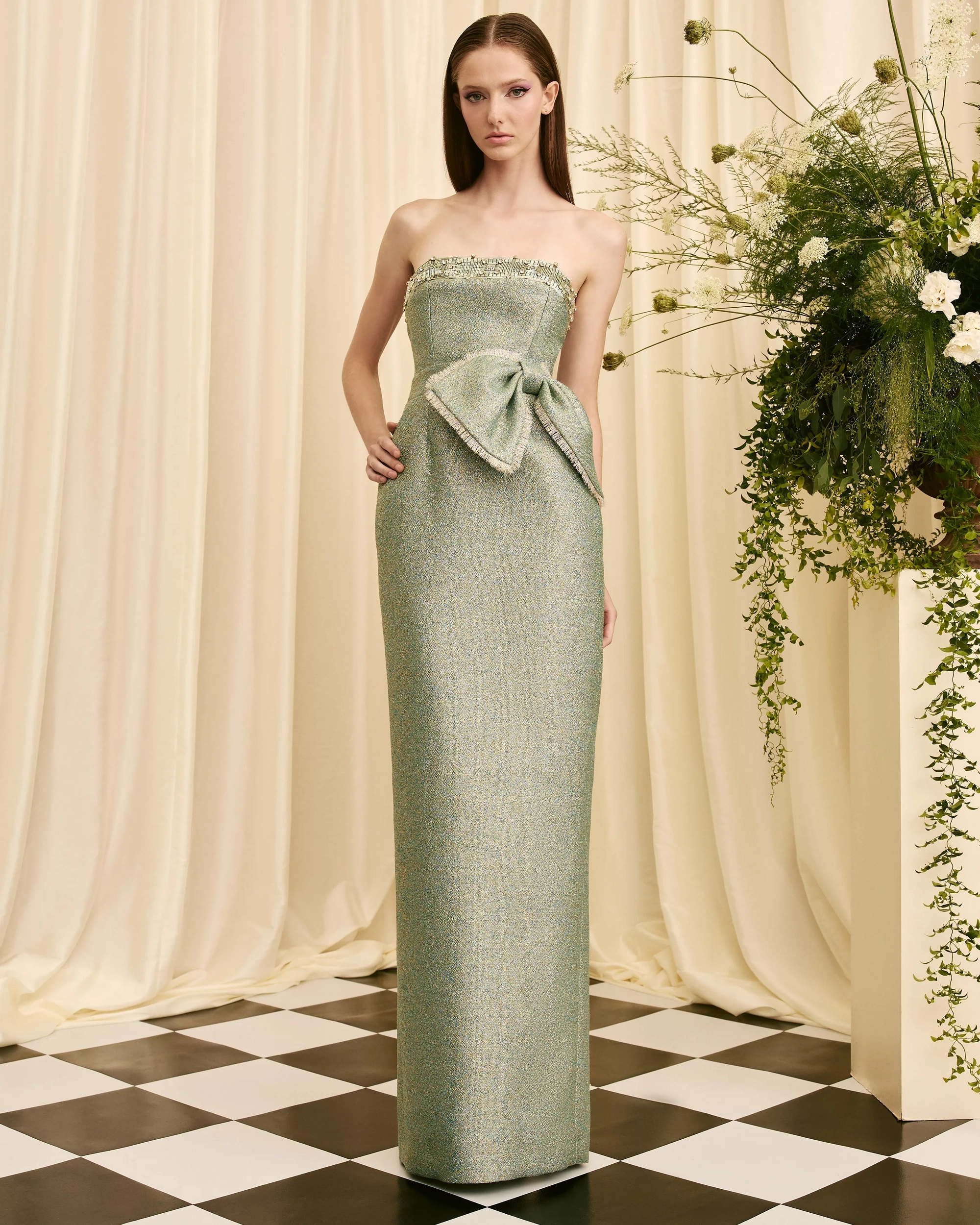 strapless gown bodice with beaded band fringed bow at waist