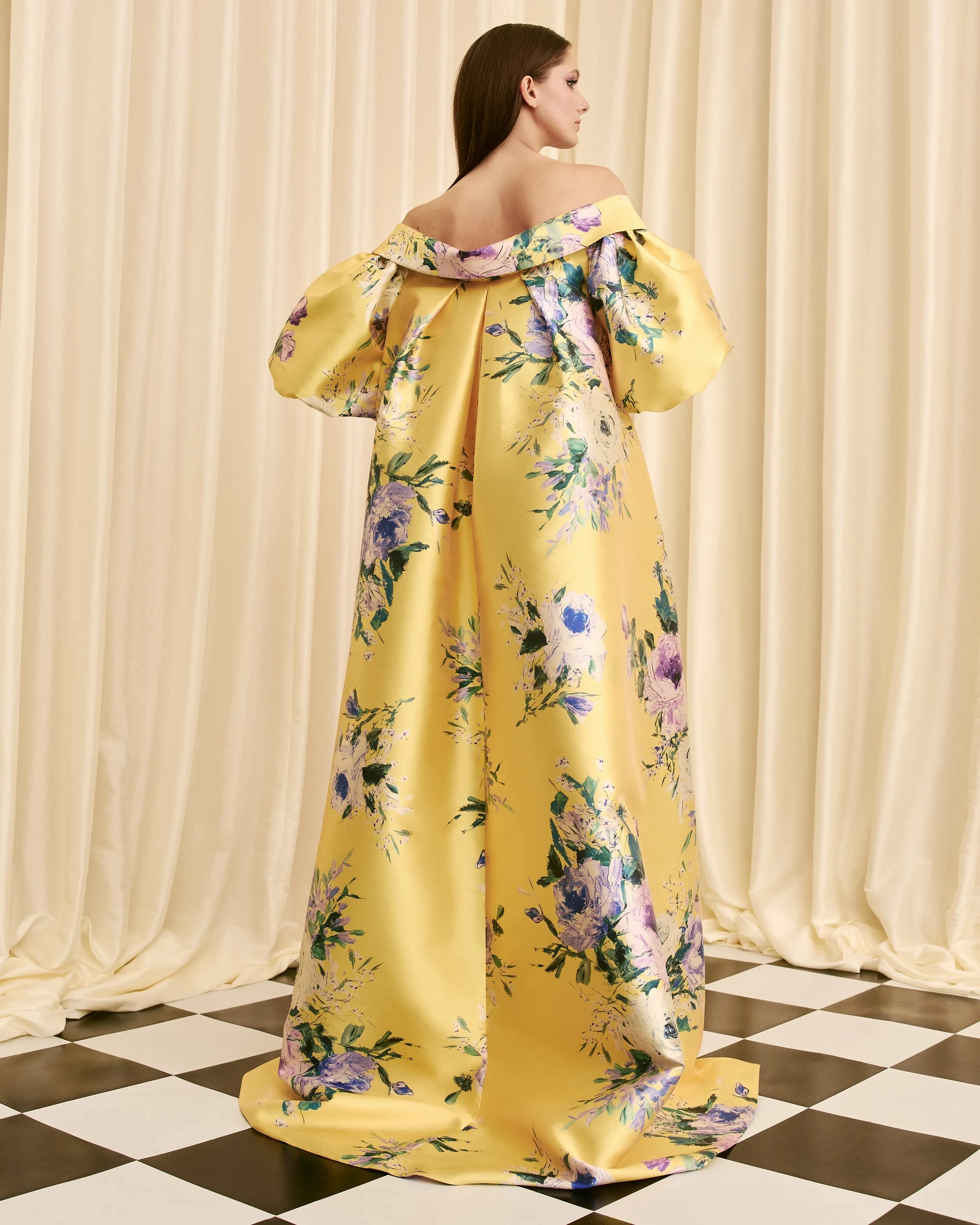 off the shoulder gown draped bodice & V neckline Opera coat, puff sleeves back pleating detail