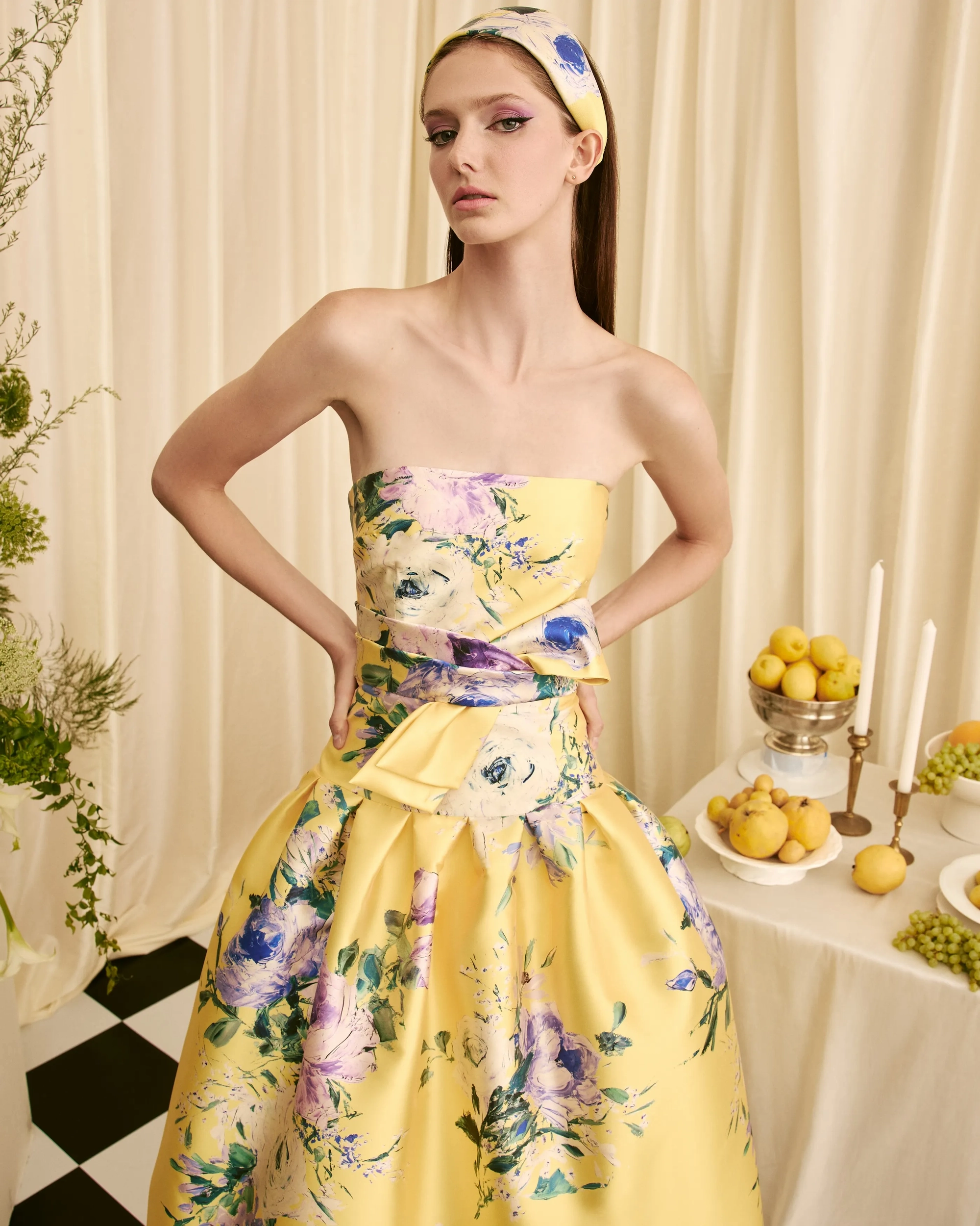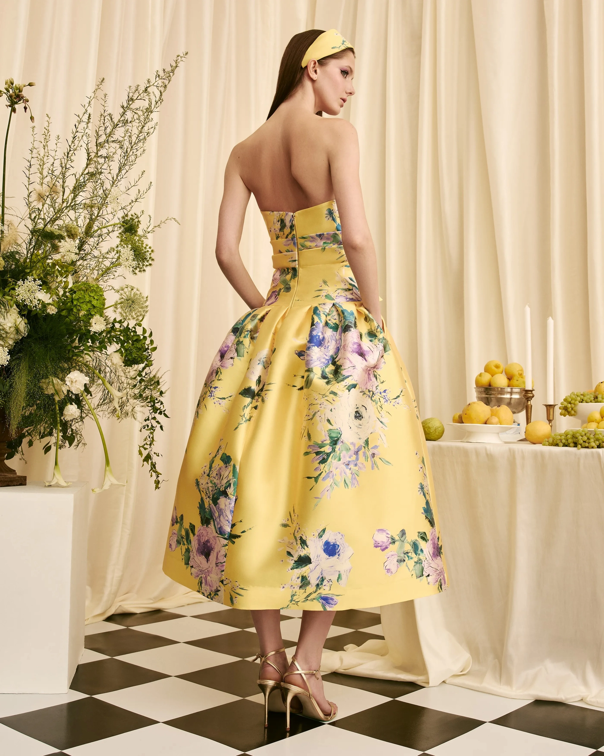 strapless midi dress draped bow detail dropped waist with pleated full skirt