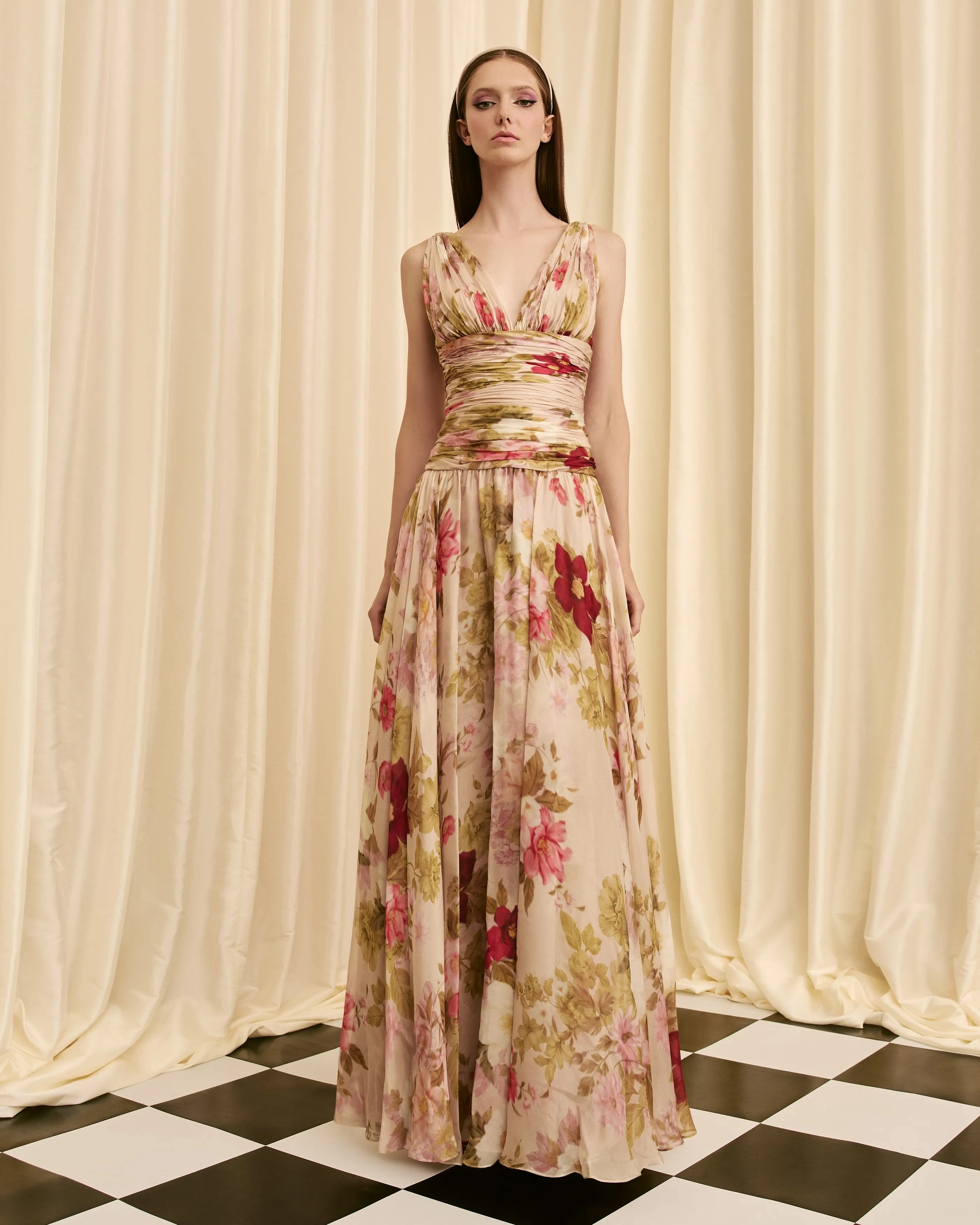 sleeveless gown draped bodice ruched wide waist band dropped waist gathered full skirt silhouette