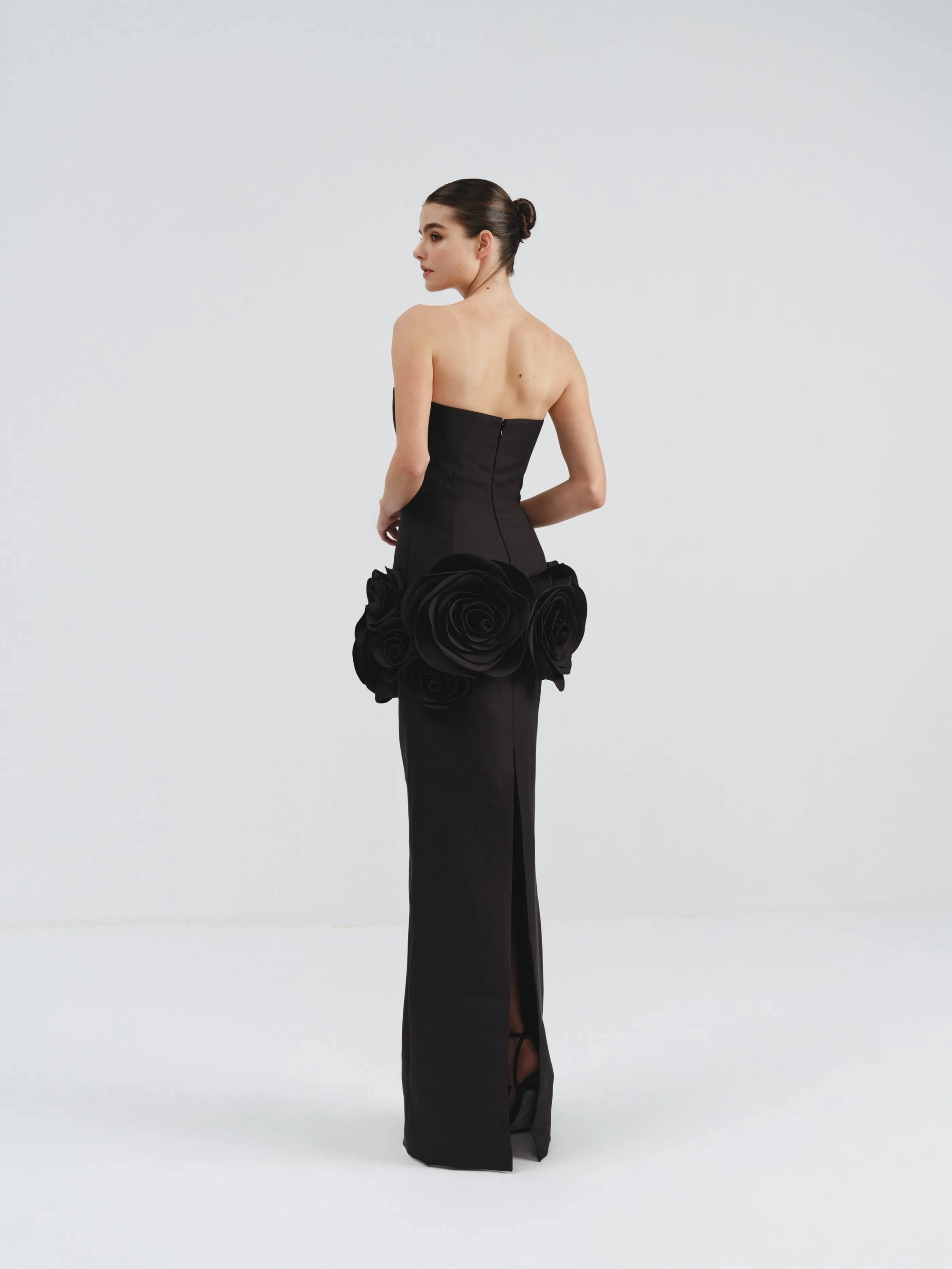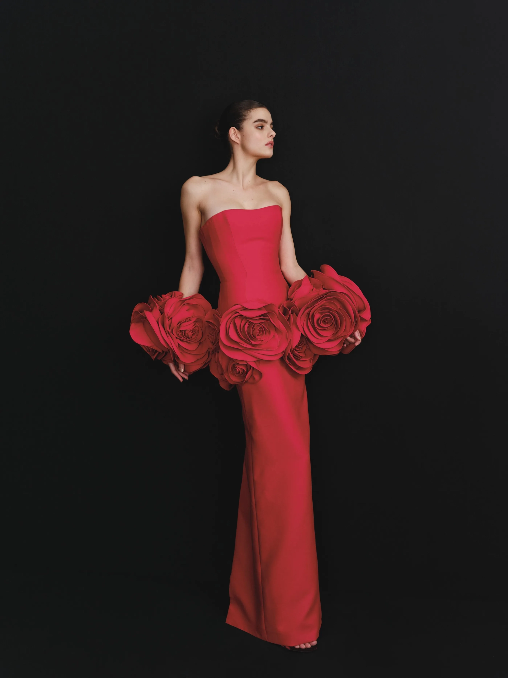 This red strapless dress features a sleek column silhouette, accentuated by oversized, sculptural roses encircling the hips for a dramatic and artistic touch. The unique floral detail adds a statement-making element to the minimalist design.