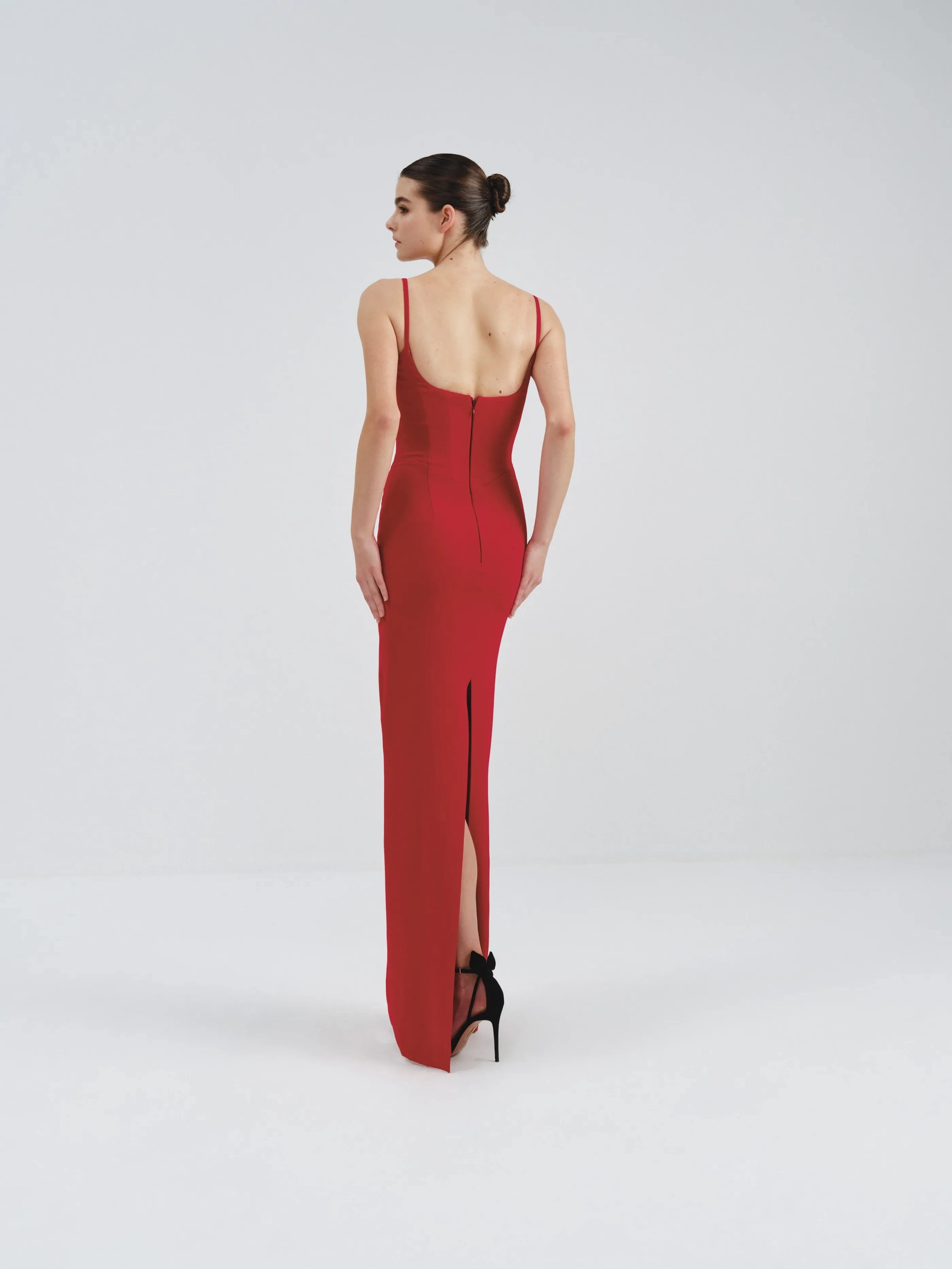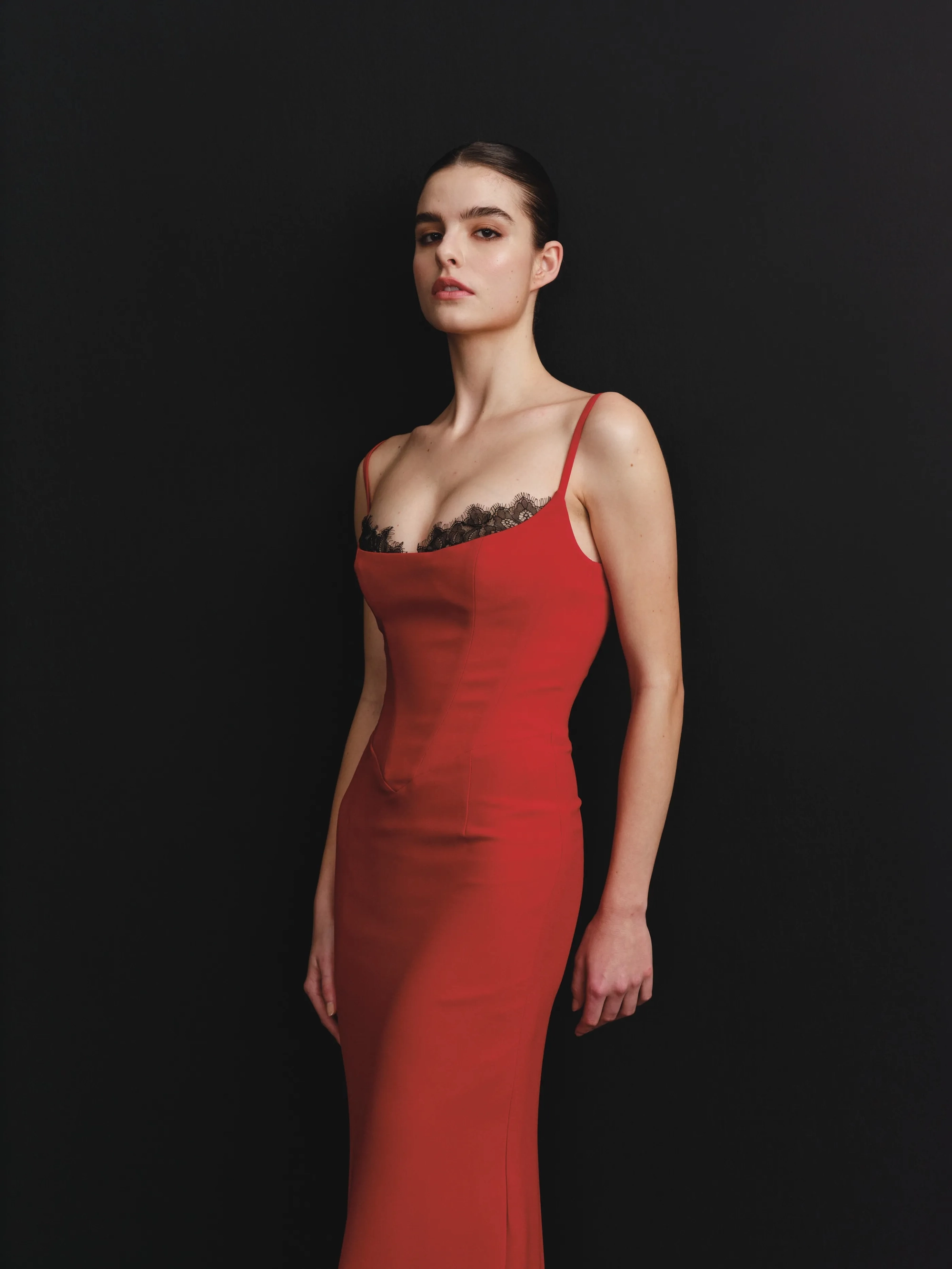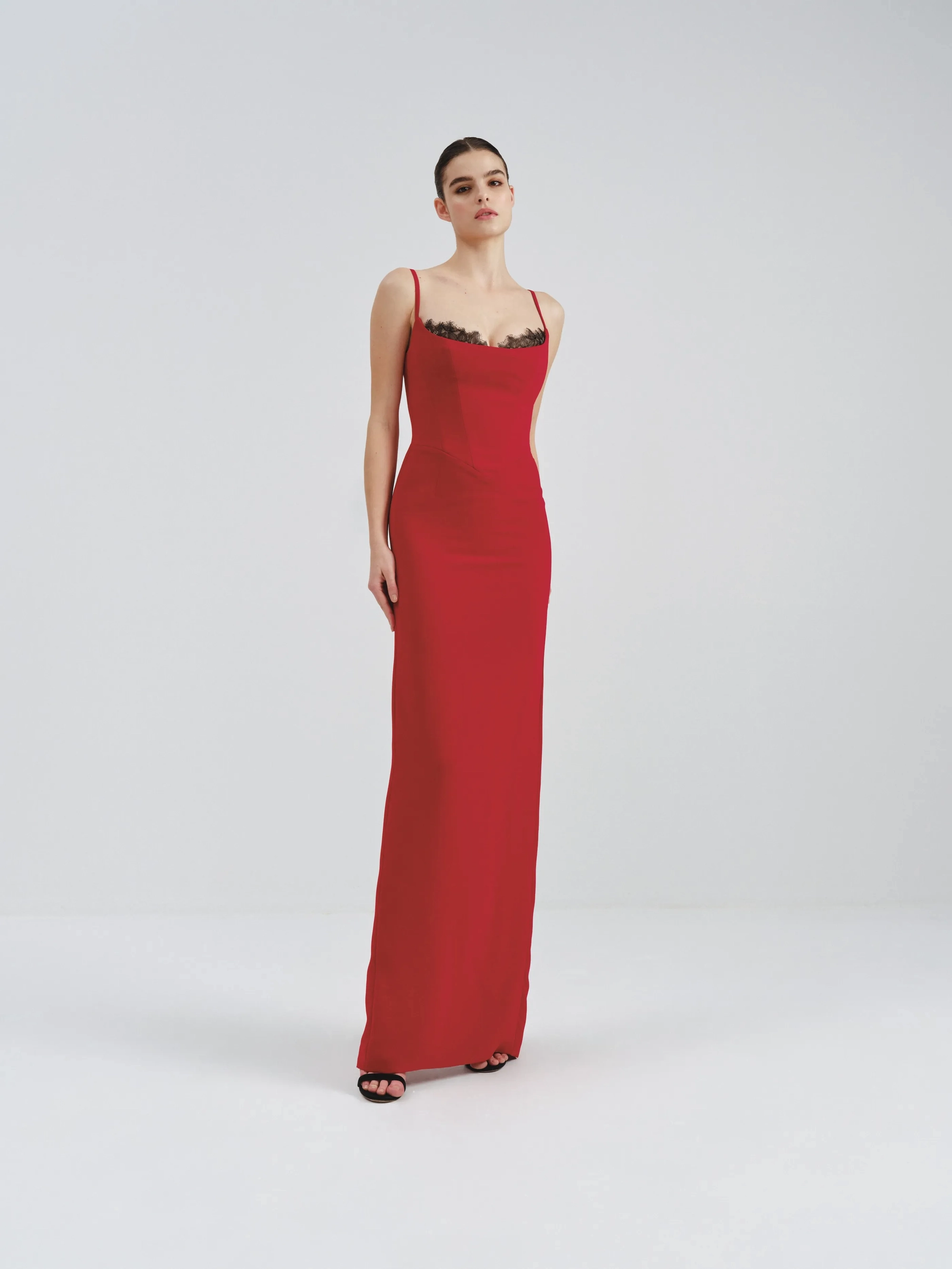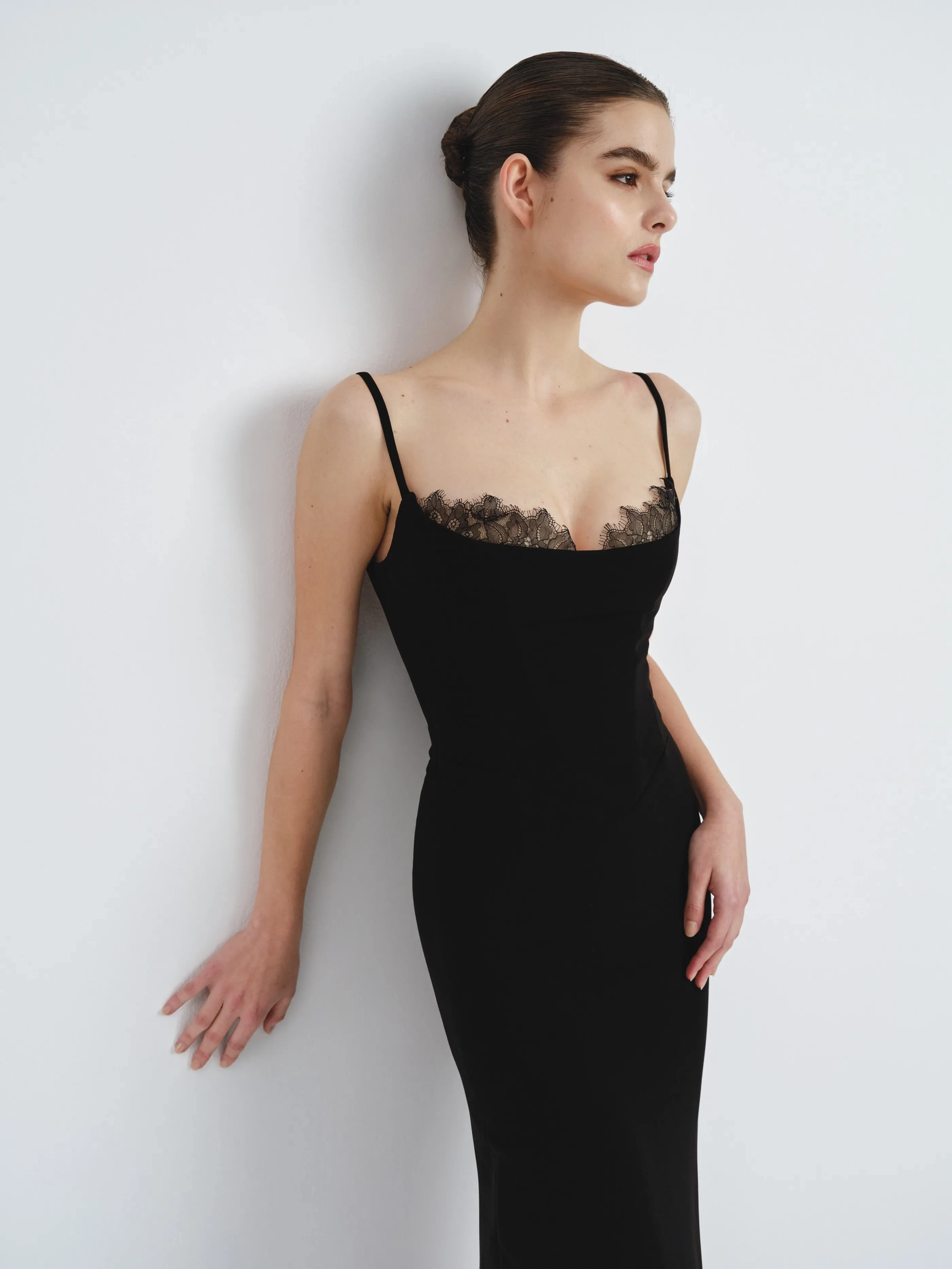 This is a sleek, fitted black dress, featuring delicate lace detailing along the neckline and thin spaghetti straps. The floor-length design enhances its timeless and sophisticated appeal.