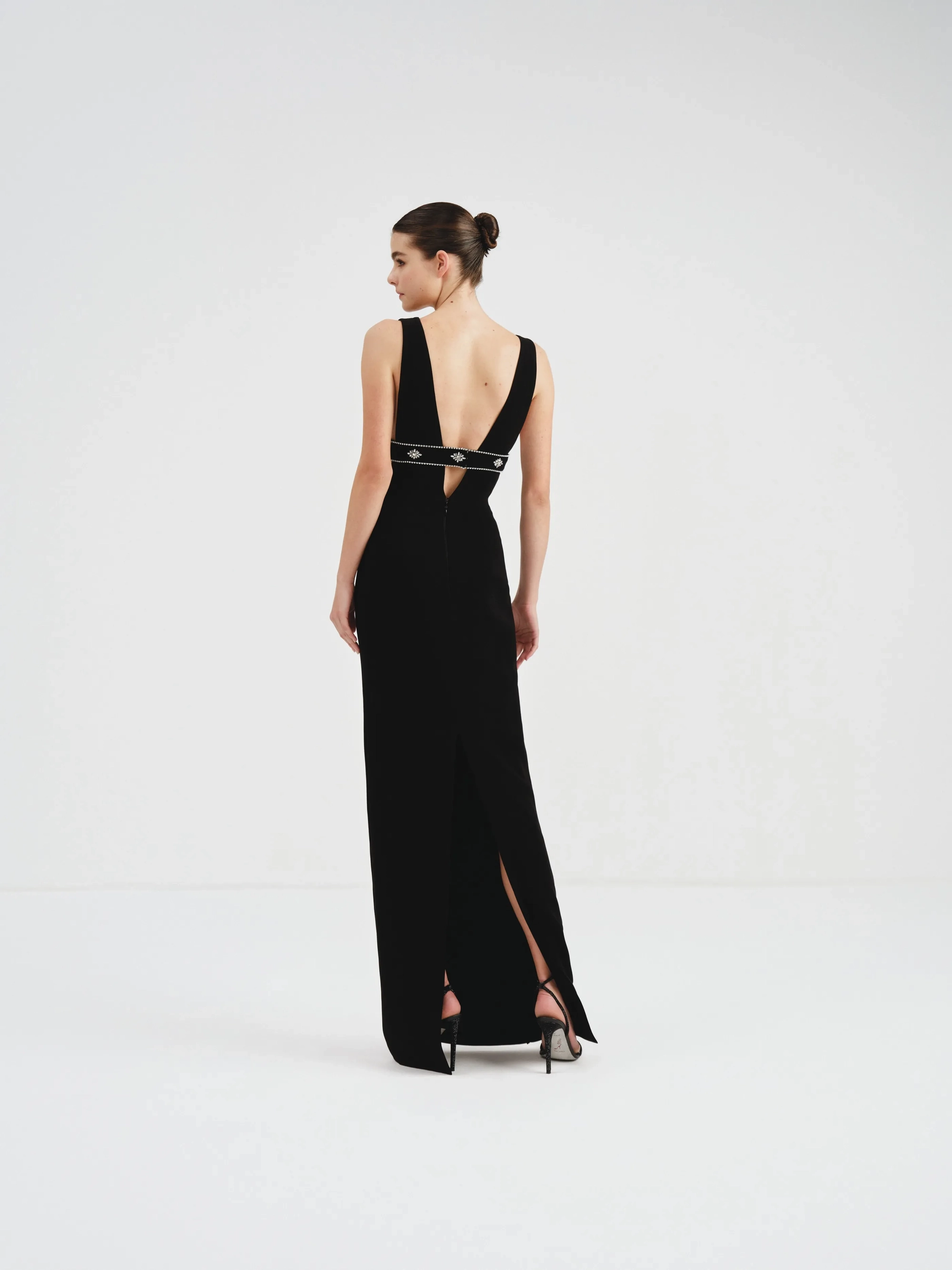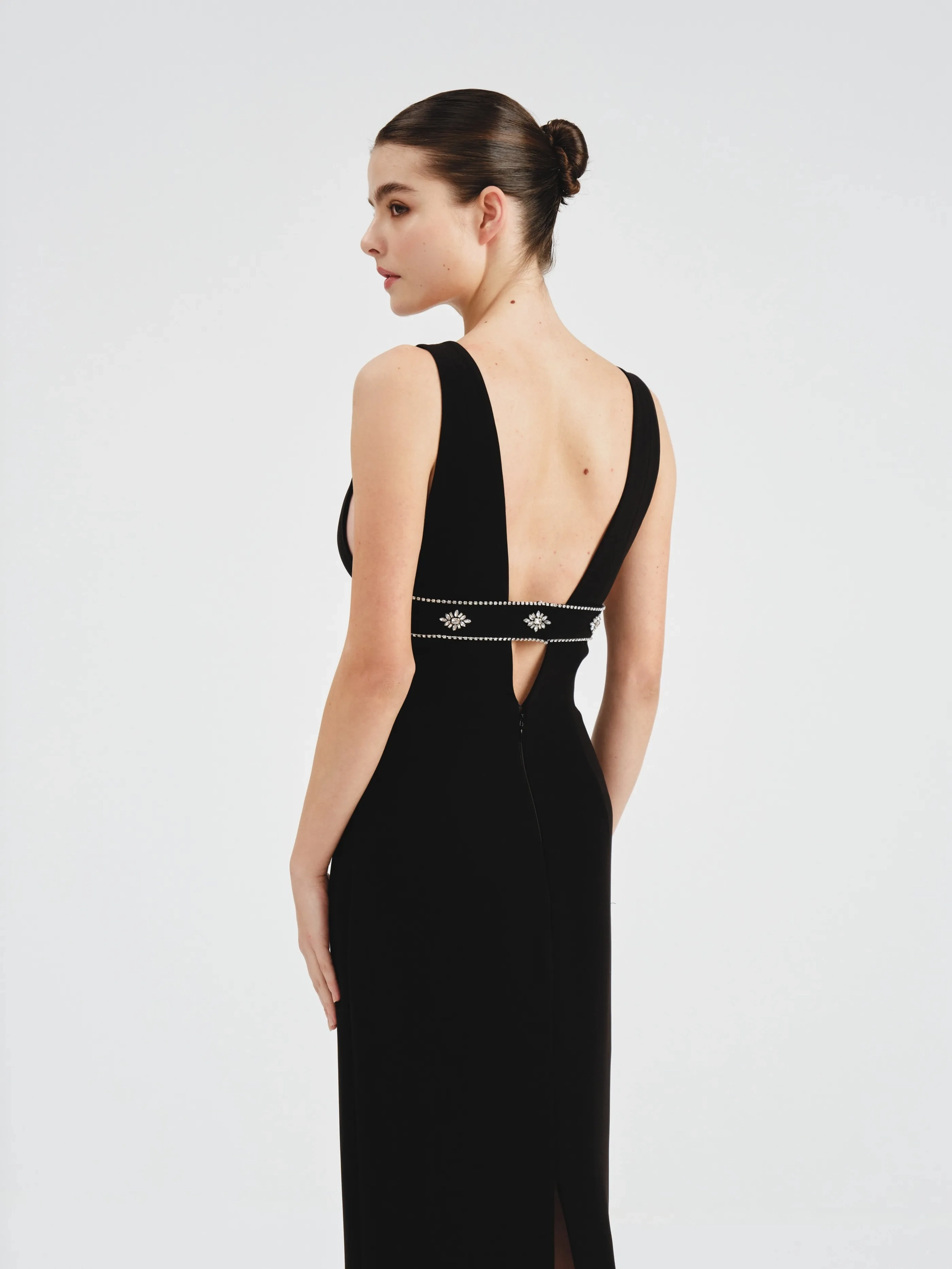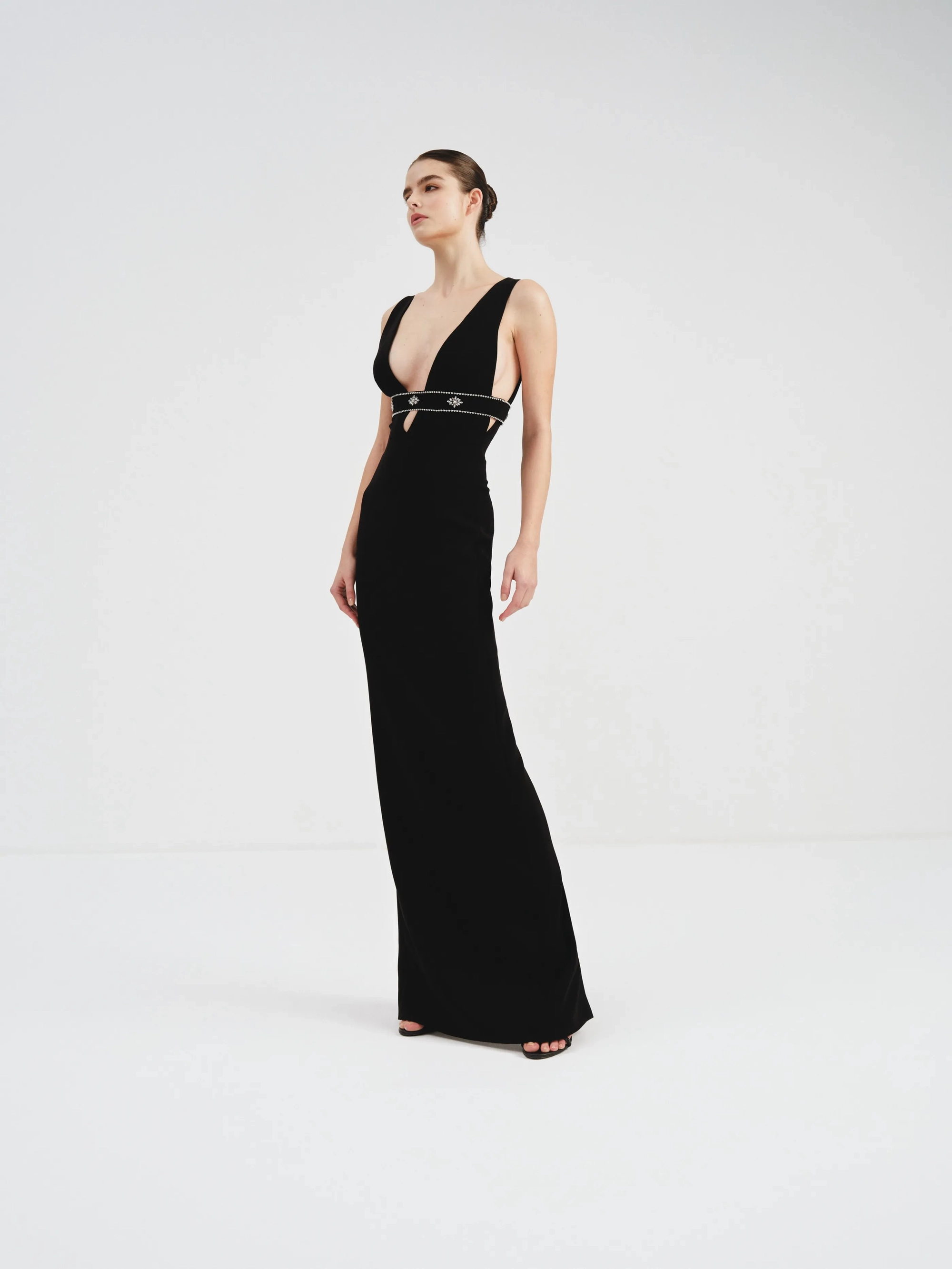 This sophisticated black dress features a daring plunging neckline. An embellished band adds a touch of sparkle to the minimalistic yet striking design.