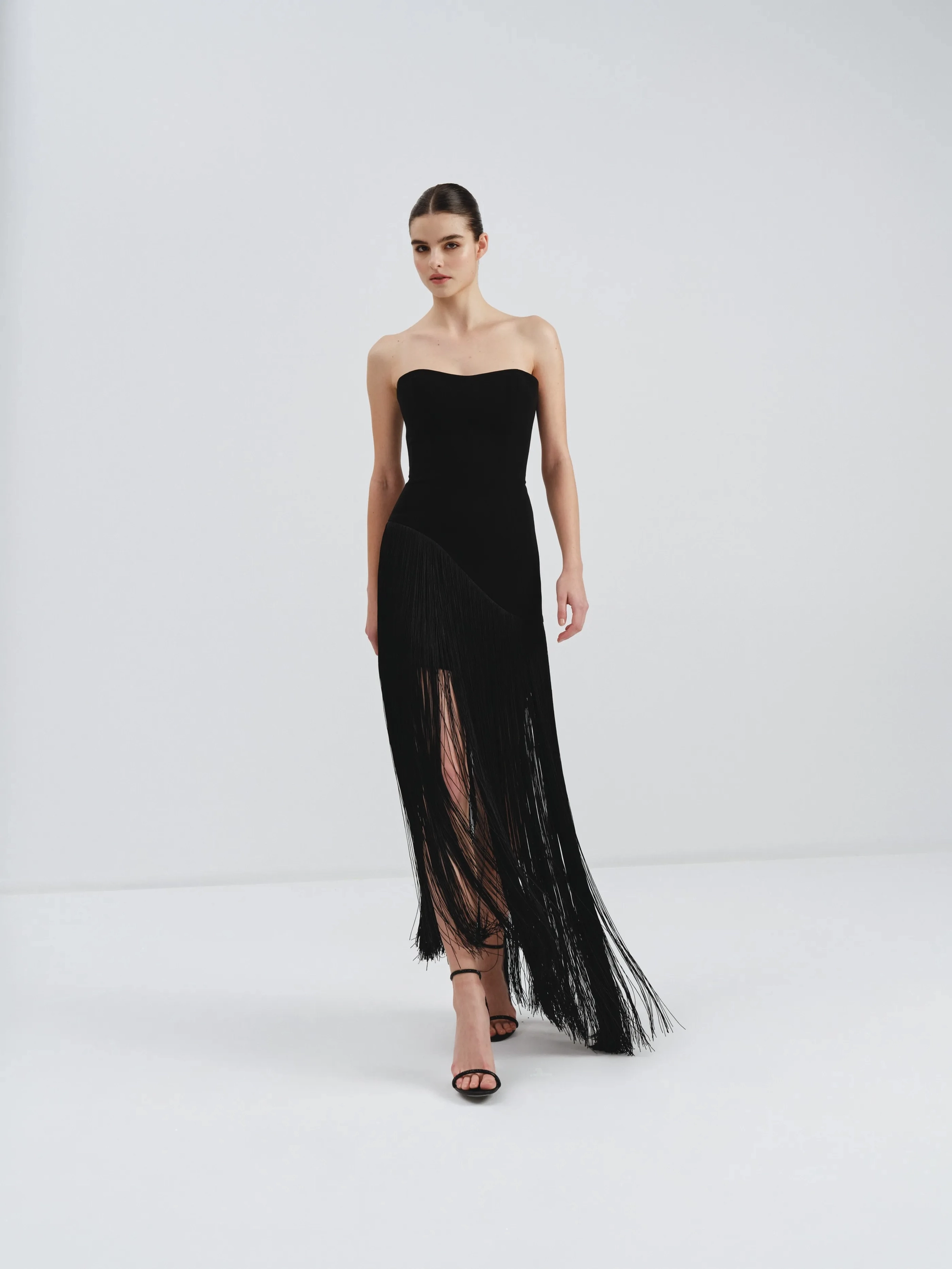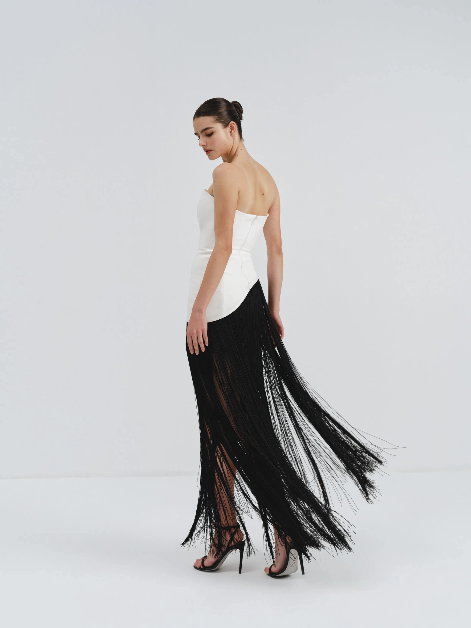This strapless white dress exudes modern sophistication with its clean bodice and structured silhouette. The design is elevated with a high-slit black skirt featuring cascading fringe, adding movement and a bold contrast to the minimalistic upper half.