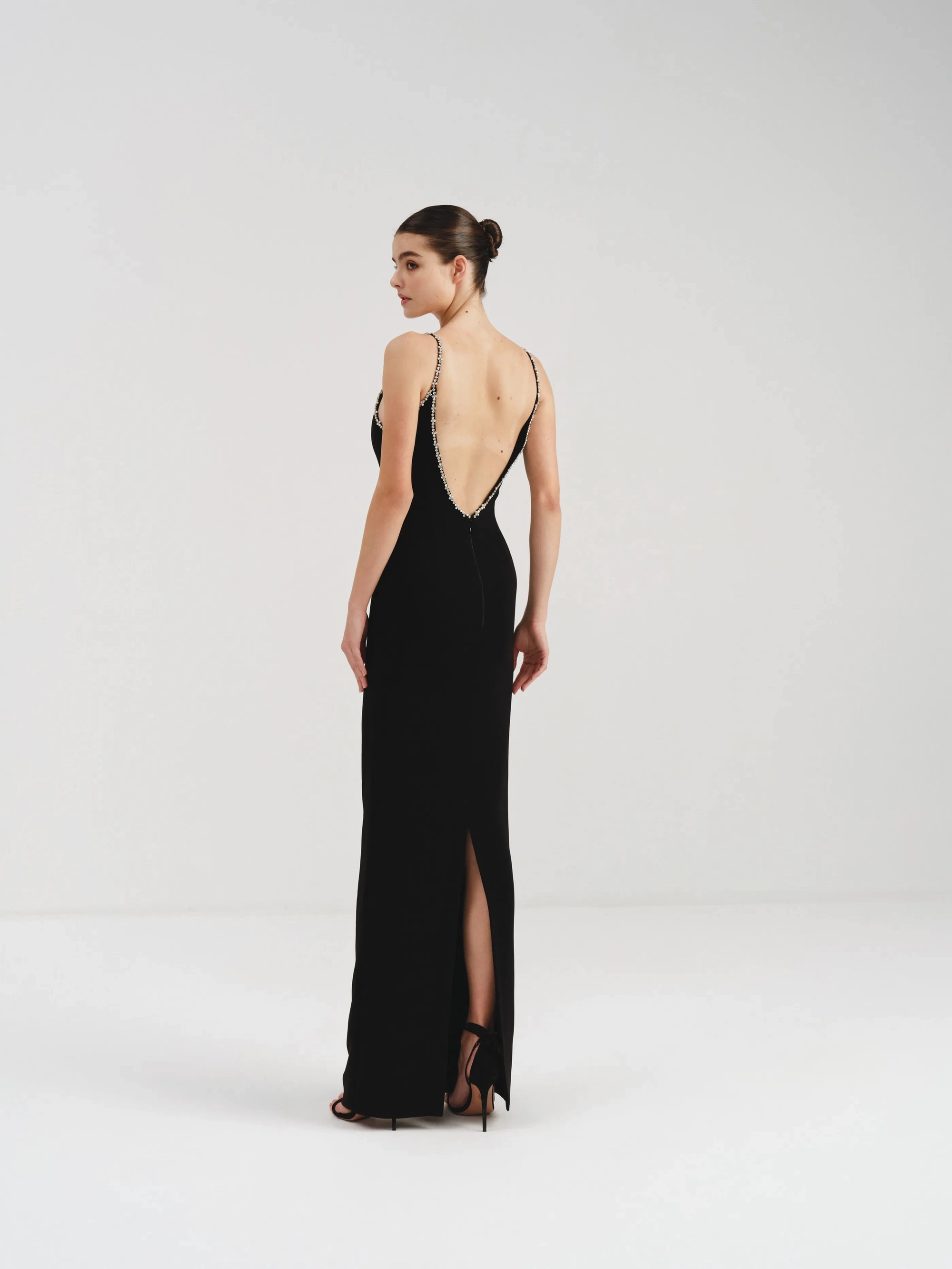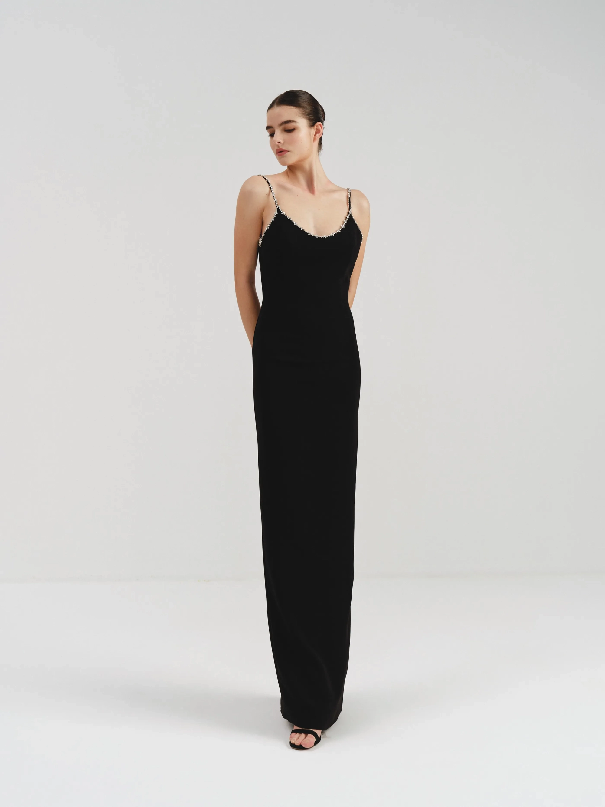 This black dress is a timeless piece, featuring a sleek silhouette and delicate embellished straps for a hint of sparkle. A perfect choice for effortless elegance at any formal event.