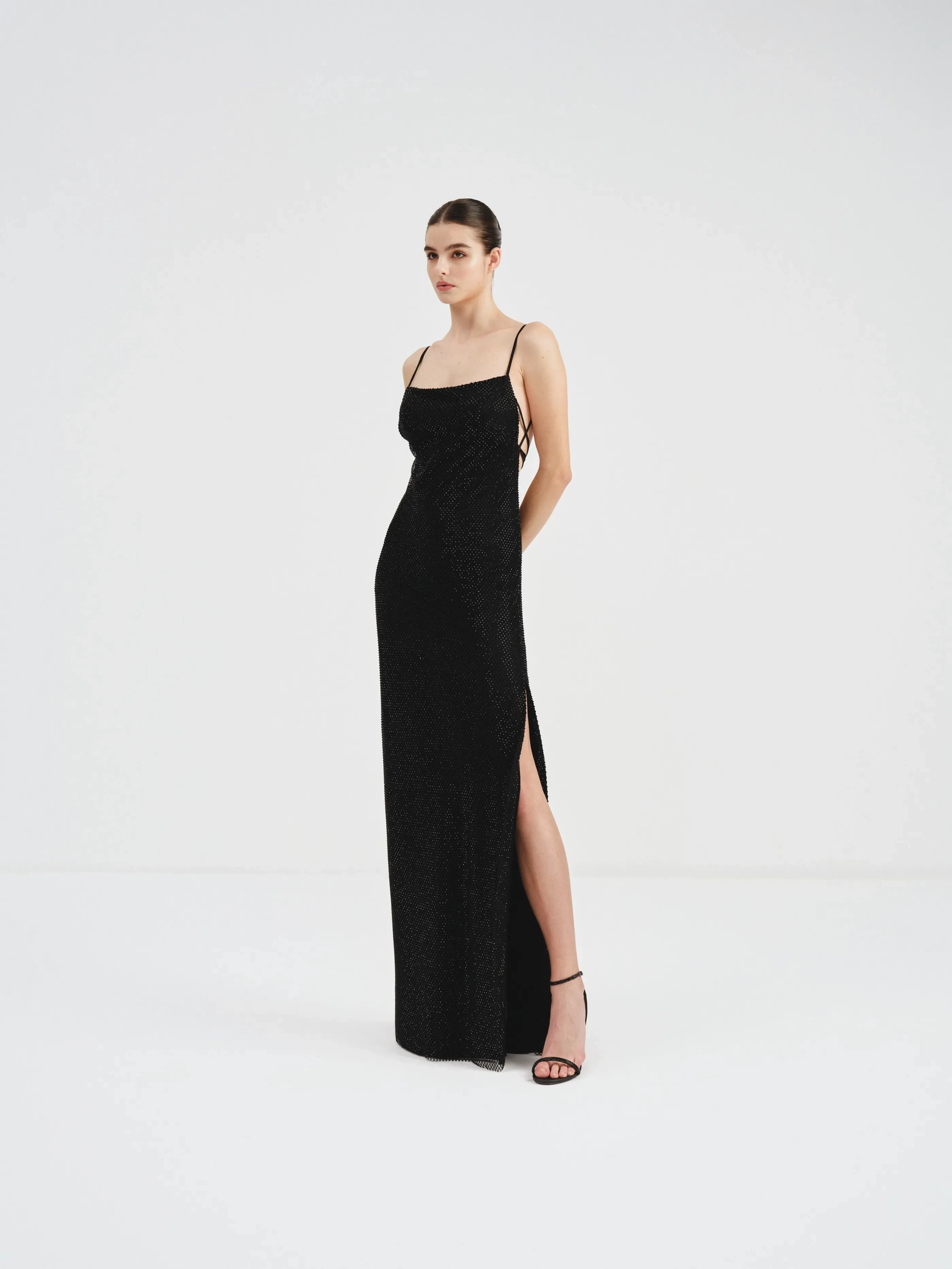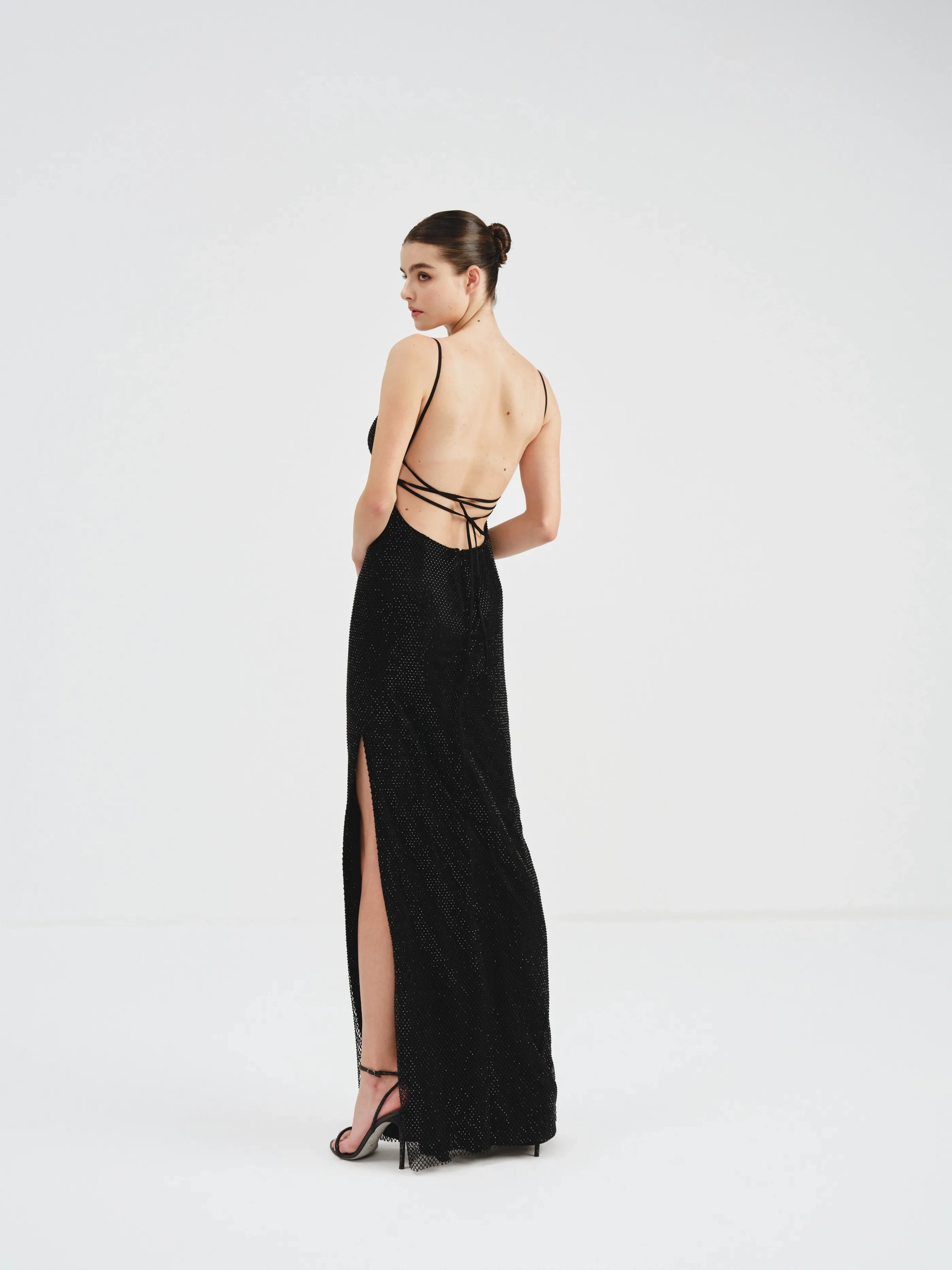 This is a sleek black evening dress featuring a square neckline with thin spaghetti straps. The crystal mesh fabric is the epitome of understated glamour and the lace-up back is perfect for creating the desired fit.