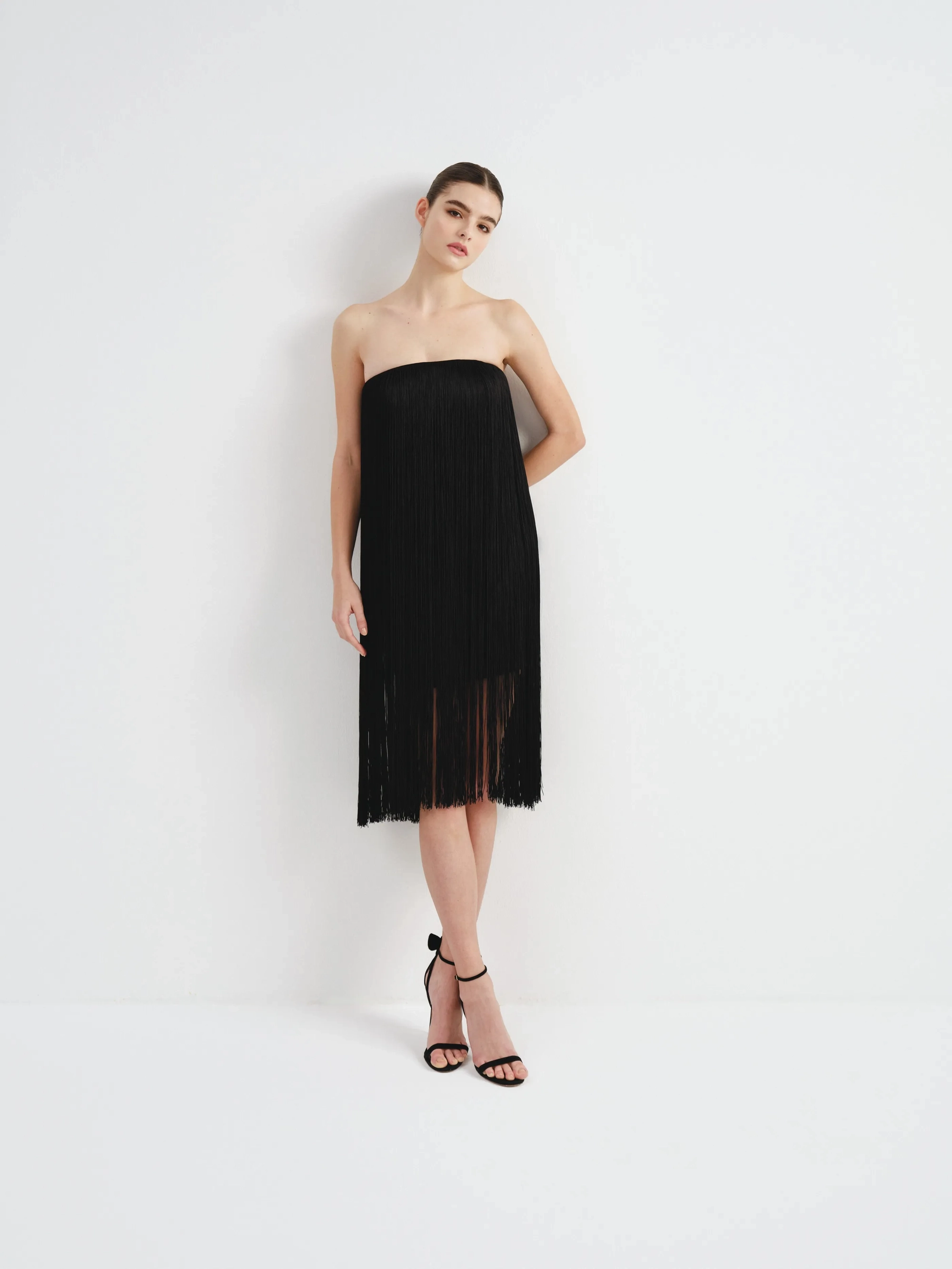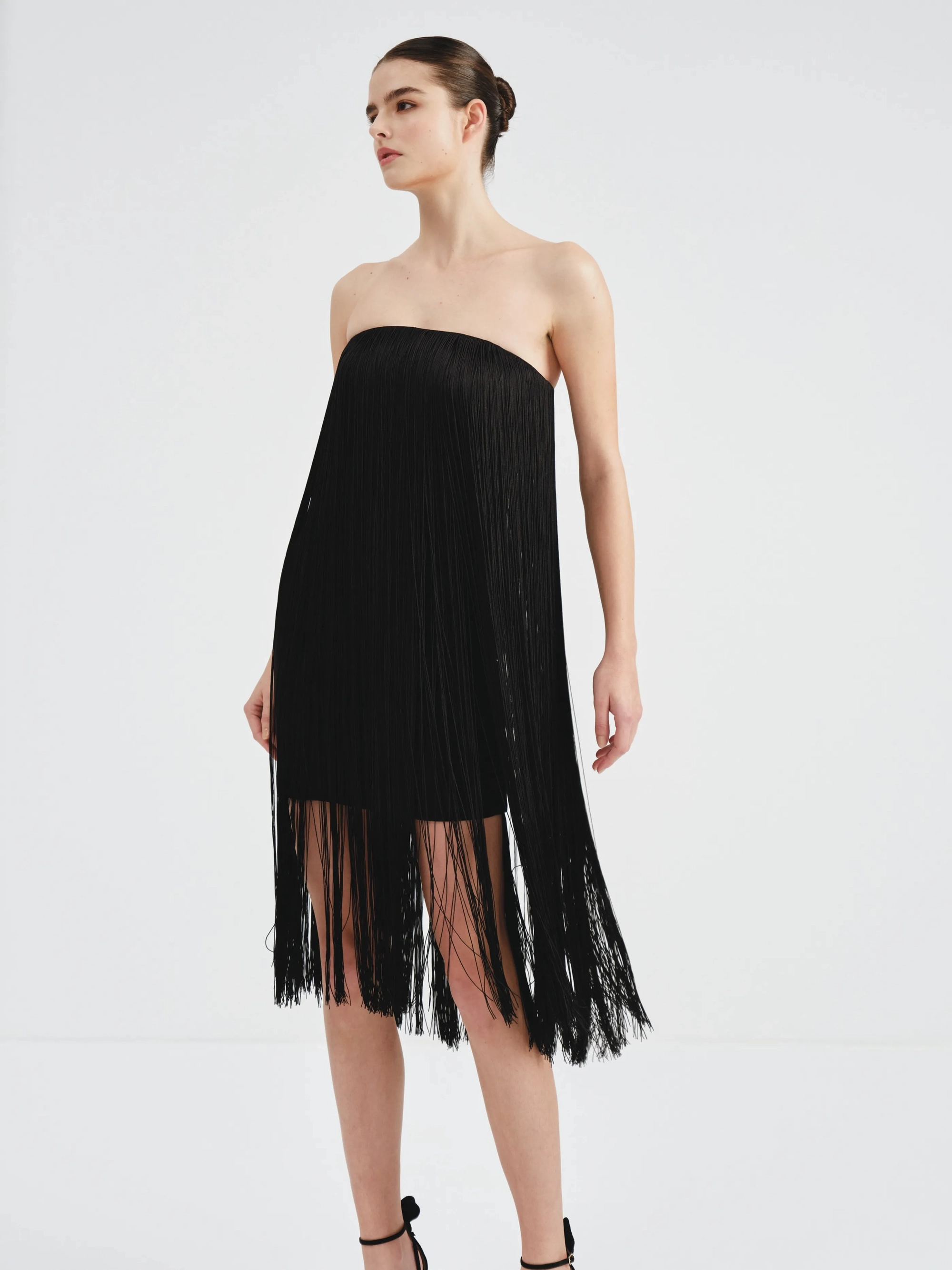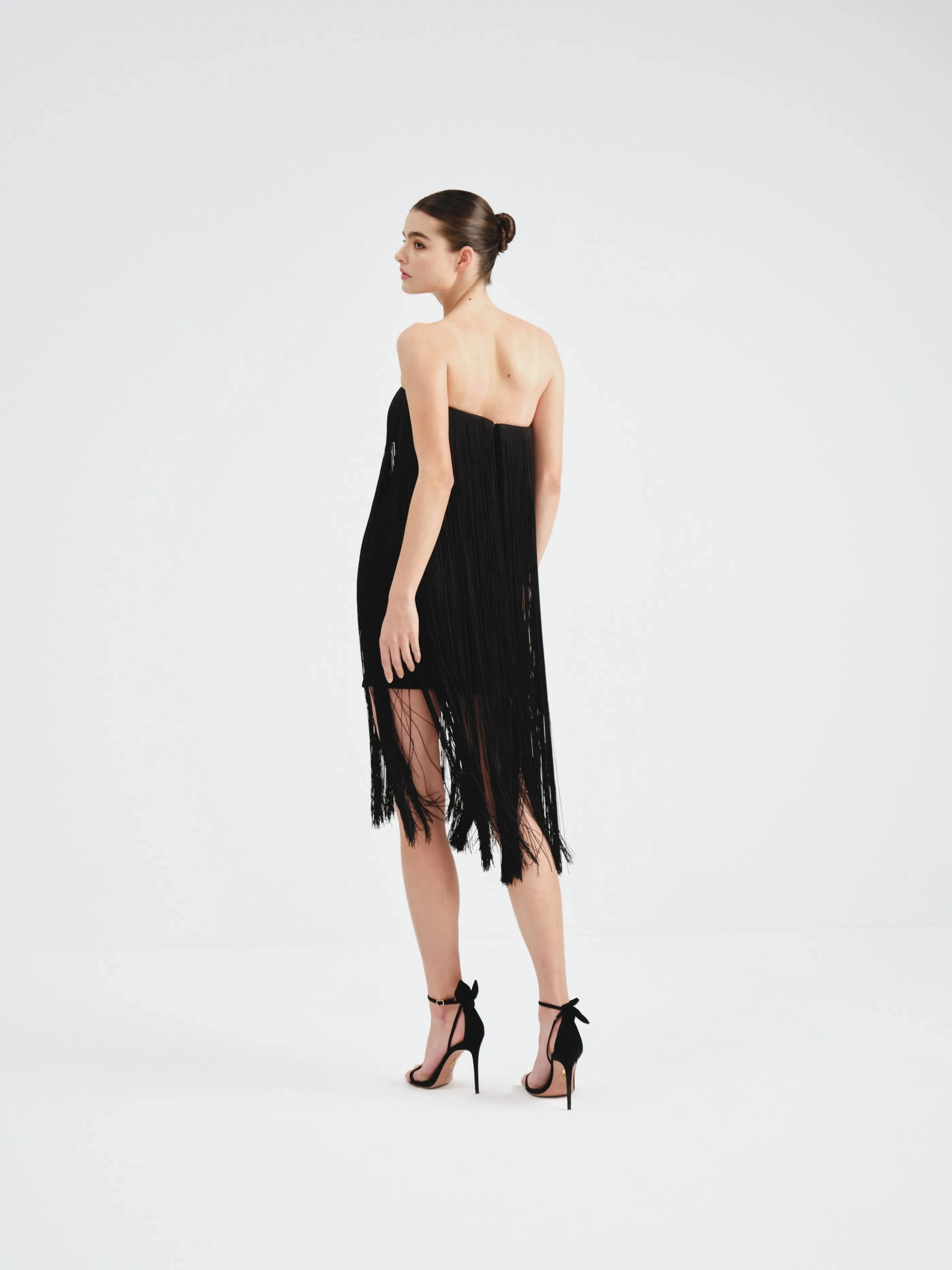 This is a bold and stylish strapless dress with a straight neckline, featuring a flowing fringe that cascades down the length of the dress. The design gives it a dramatic and dynamic look. The short, fitted base adds a contemporary edge to the glamorous aesthetic.