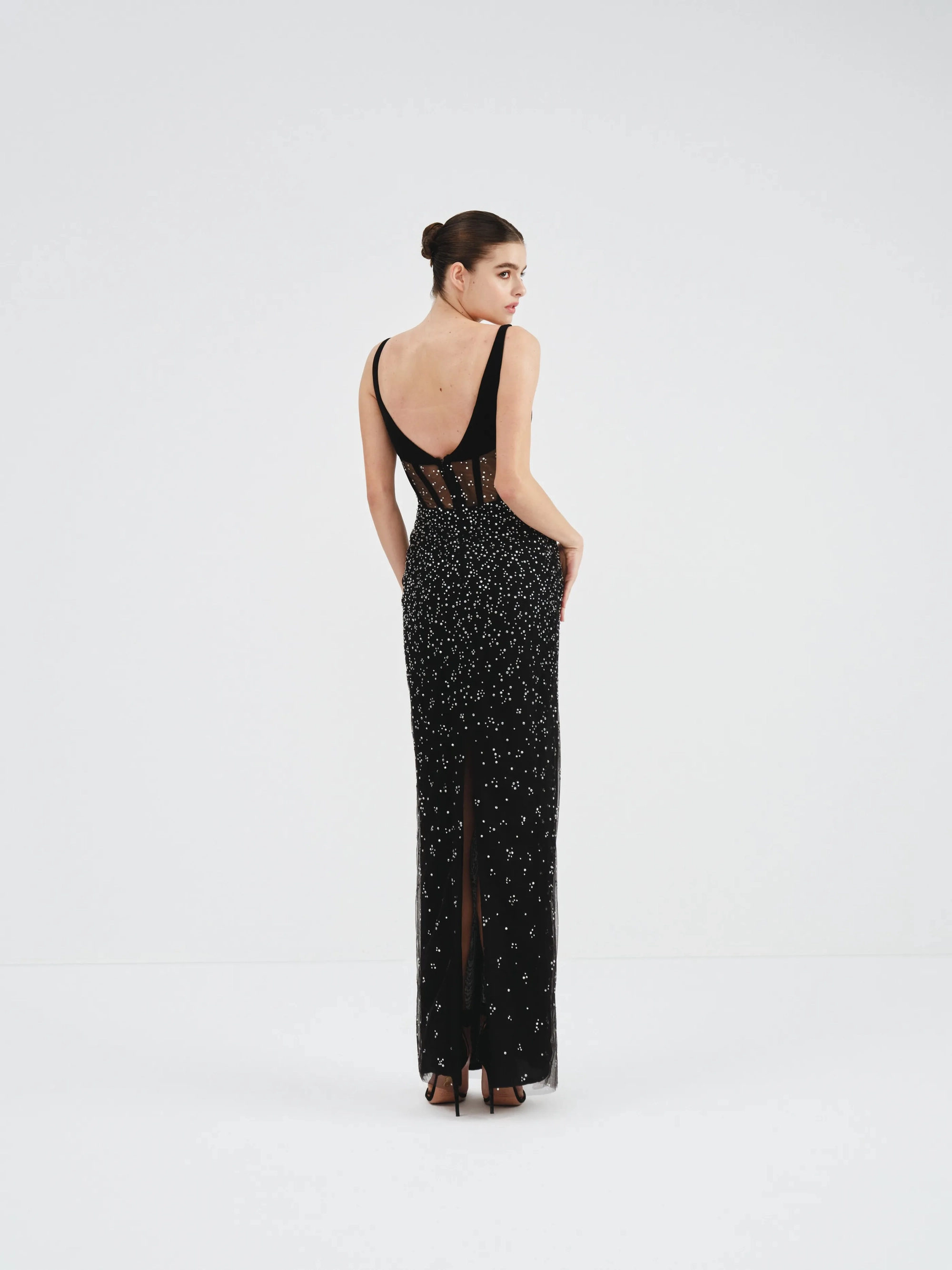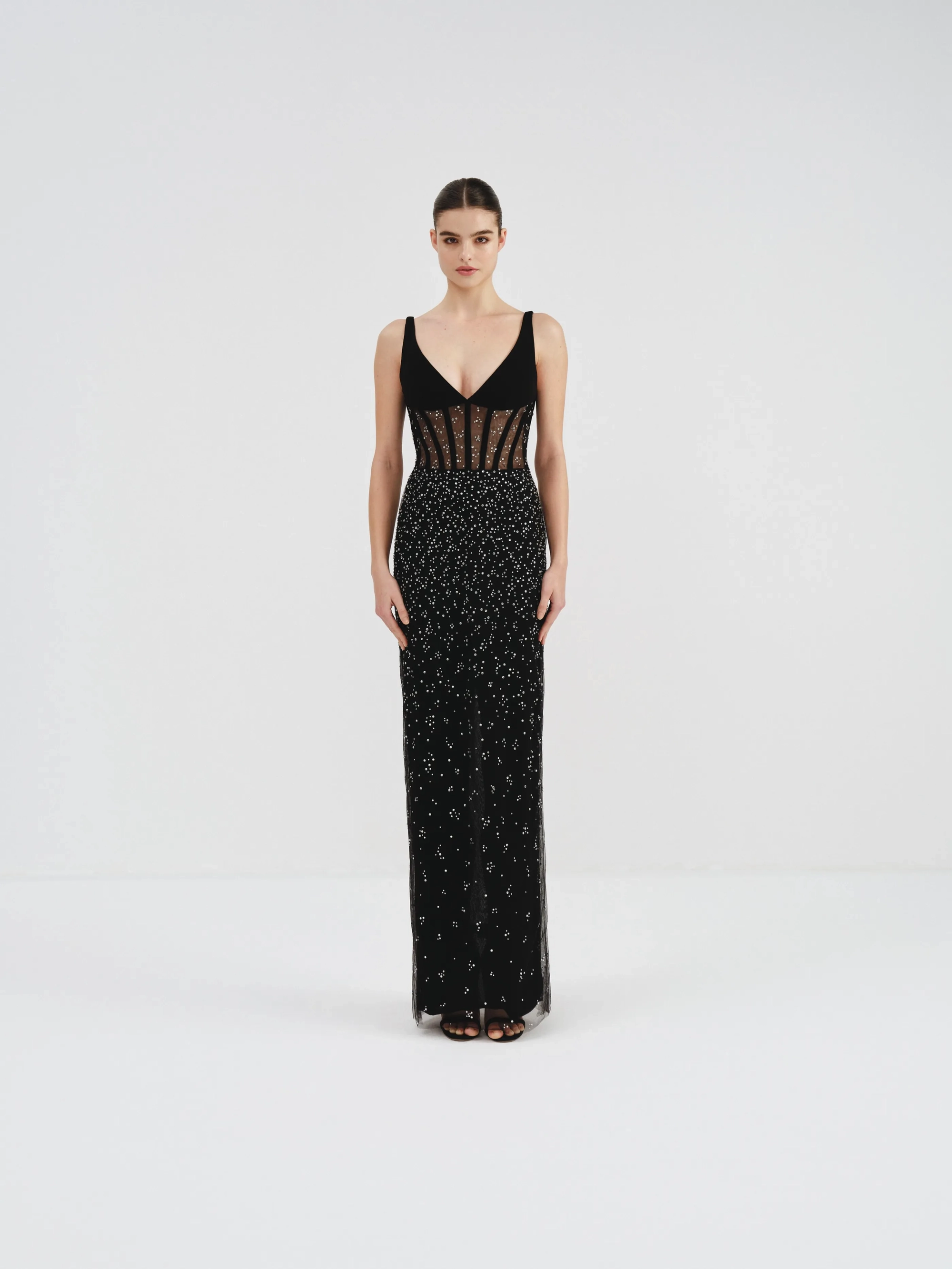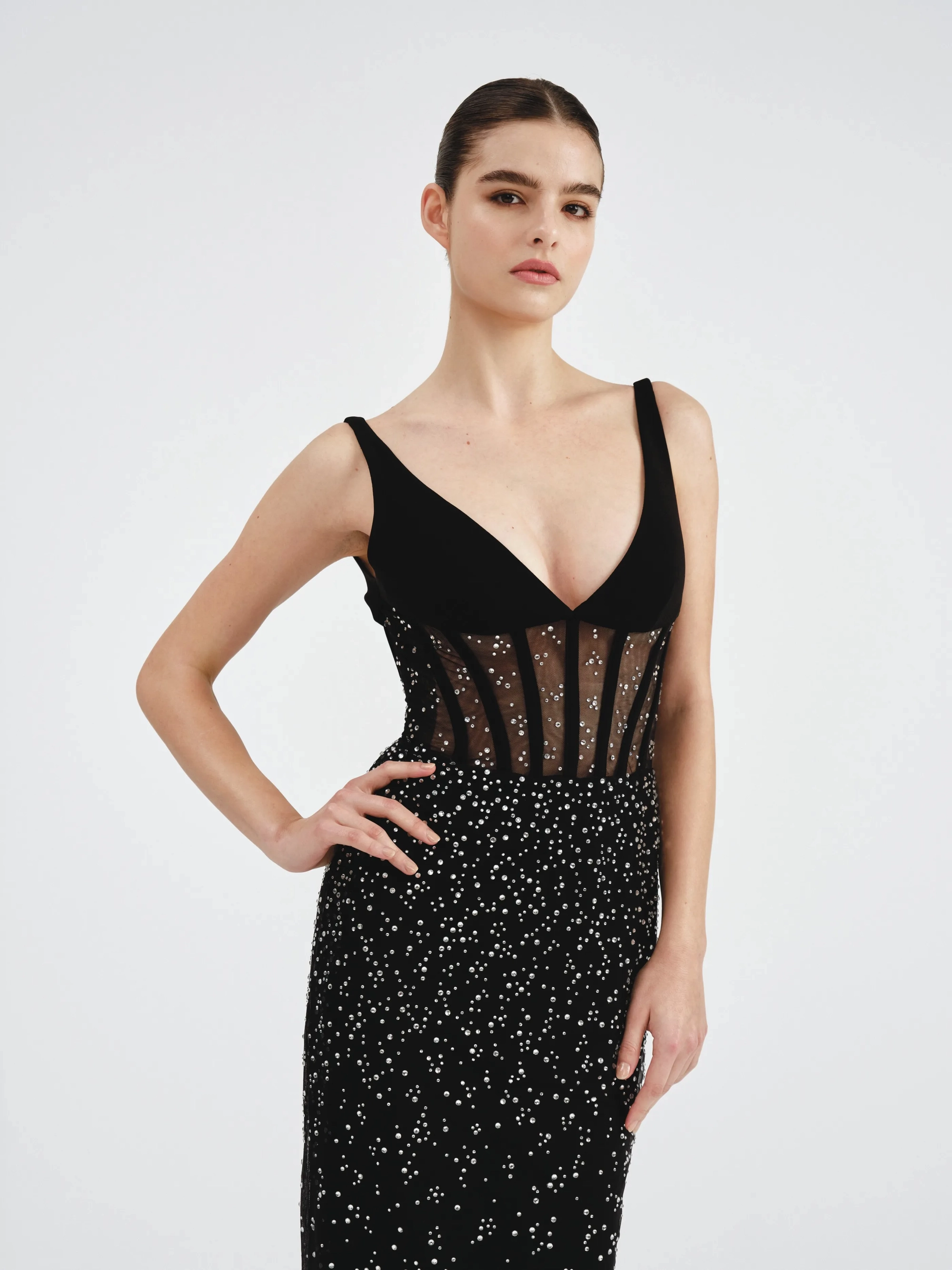 A black dress with sheer corset bodice, sparkling embellishments, and a plunging neckline. It features a fitted silhouette adorned with shimmering crystals all over.