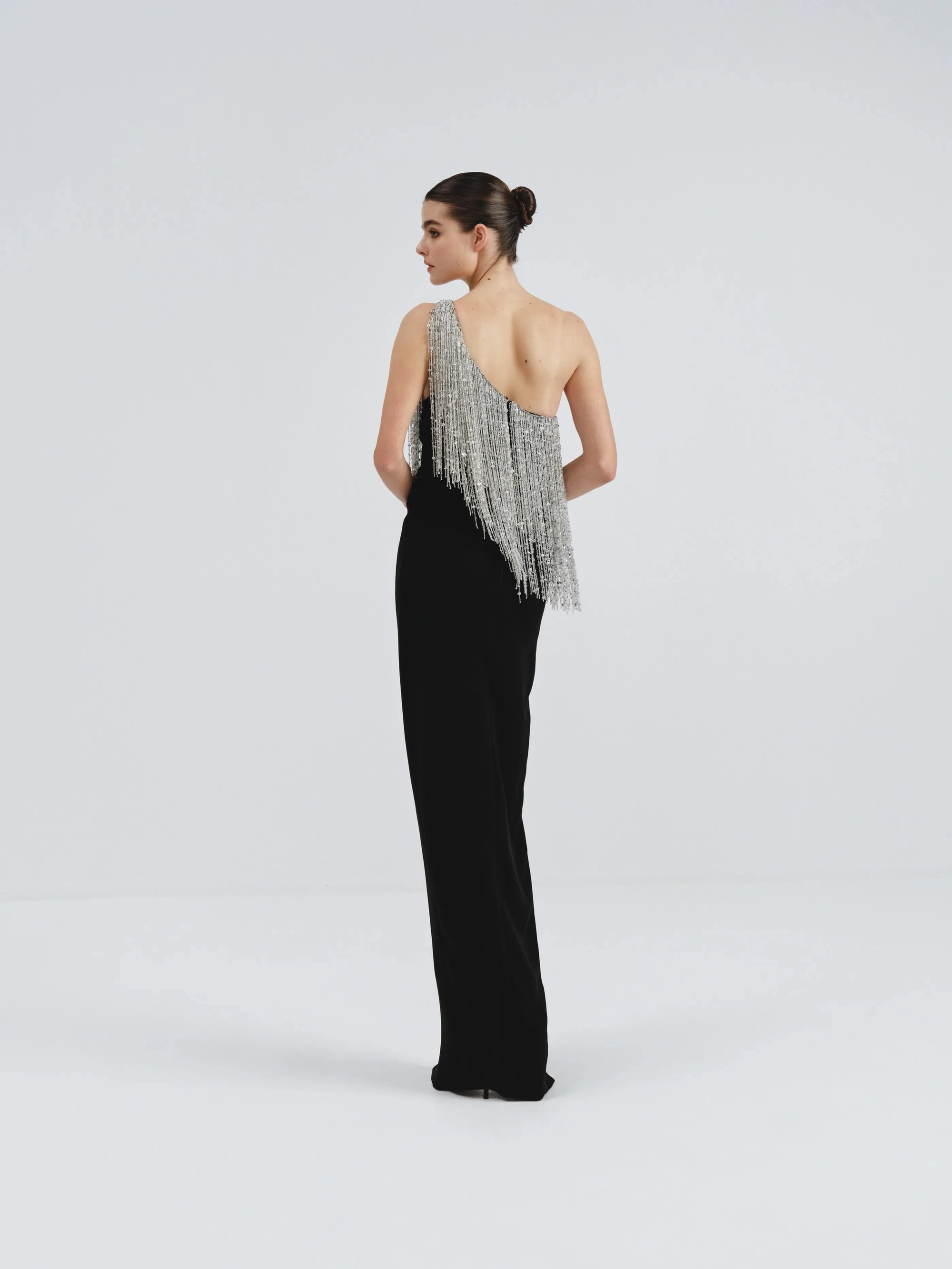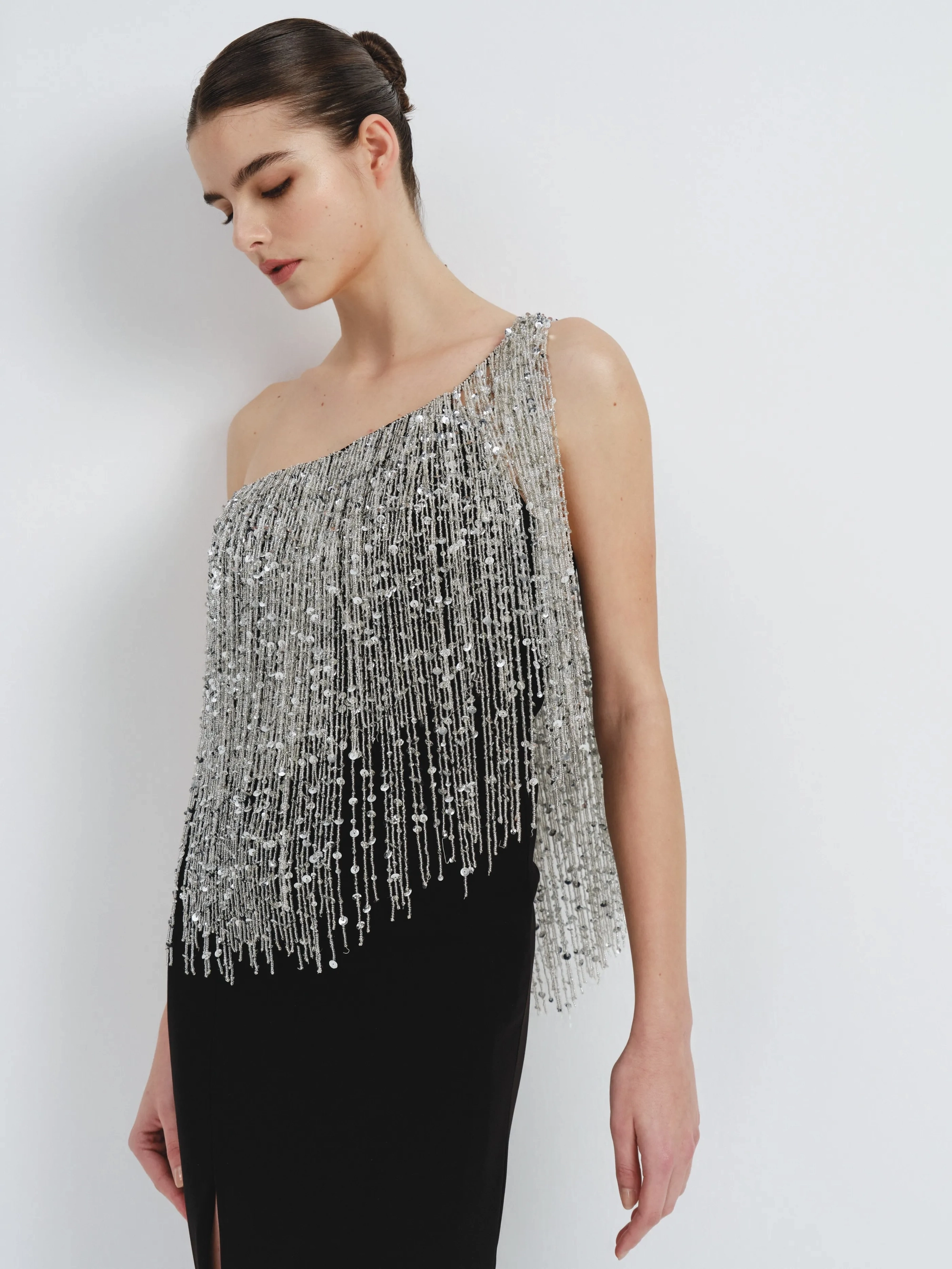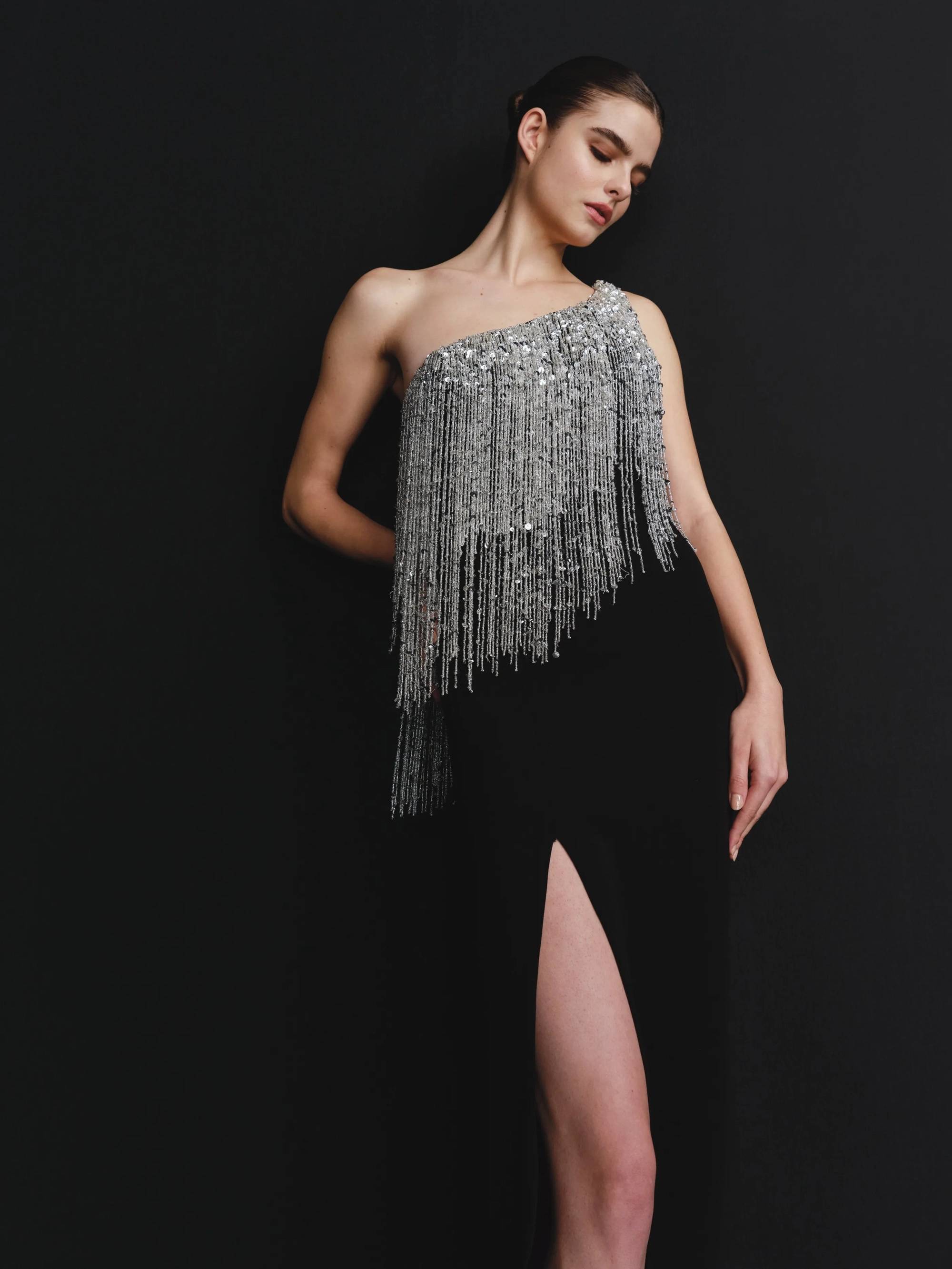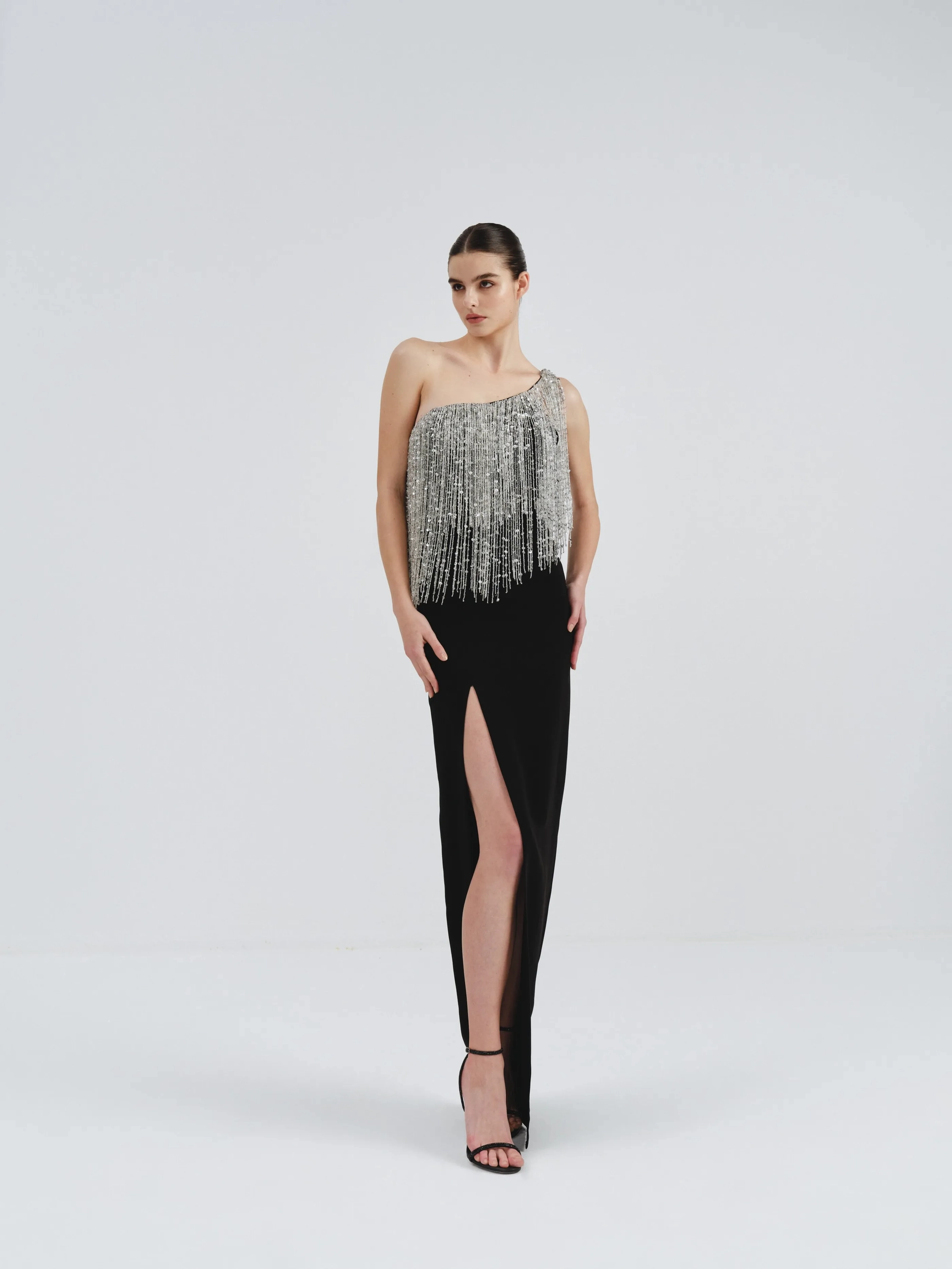 A sleek black dress with one-shoulder silver fringe design and a high slit. It is the perfect balance of glamour and modern allure.