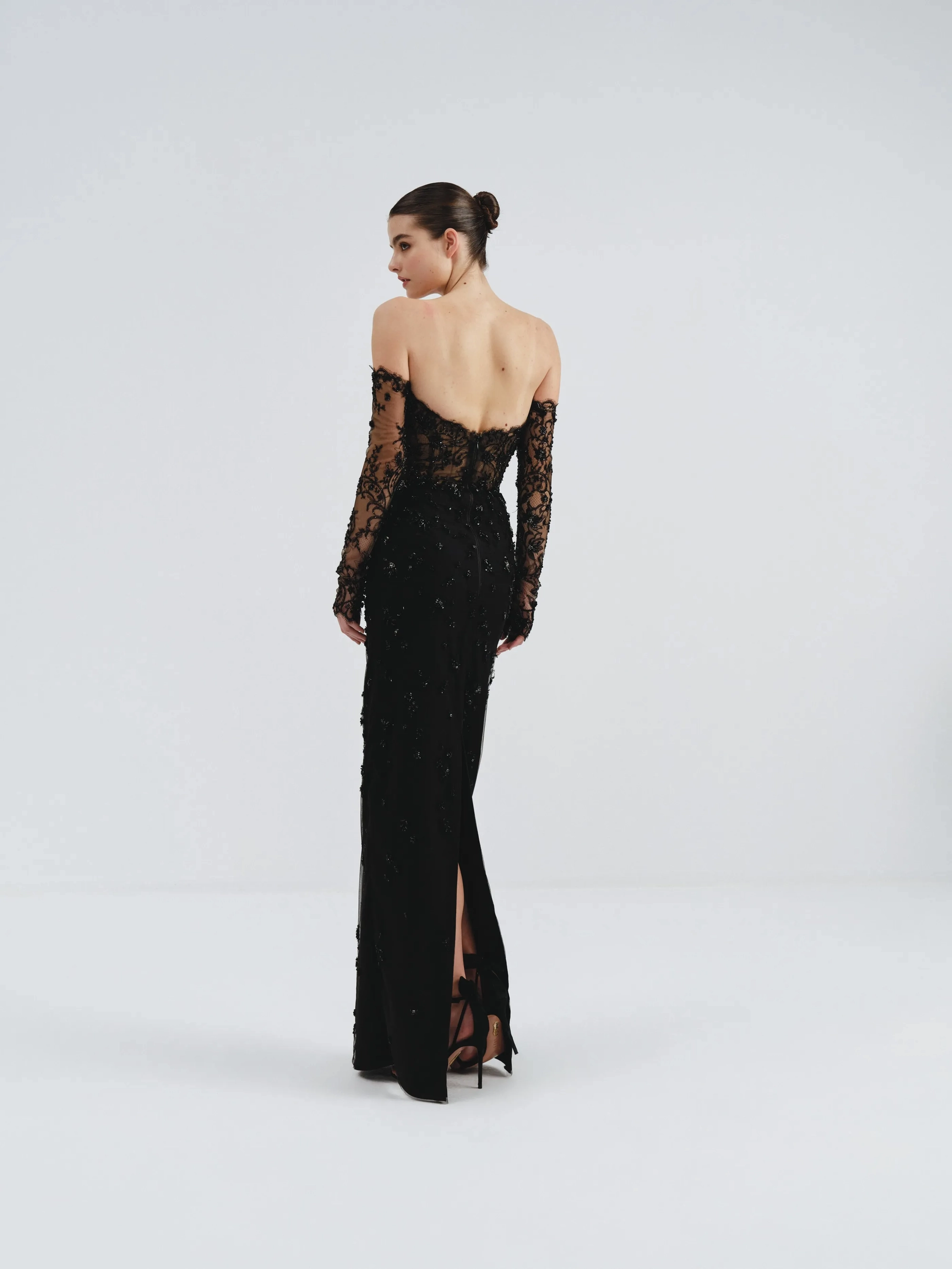 This stunning black gown features intricate lace detailing and a figure-hugging silhouette for timeless elegance. The off shoulder design and sheer long sleeves add a touch of allure, making it perfect for formal occasions.