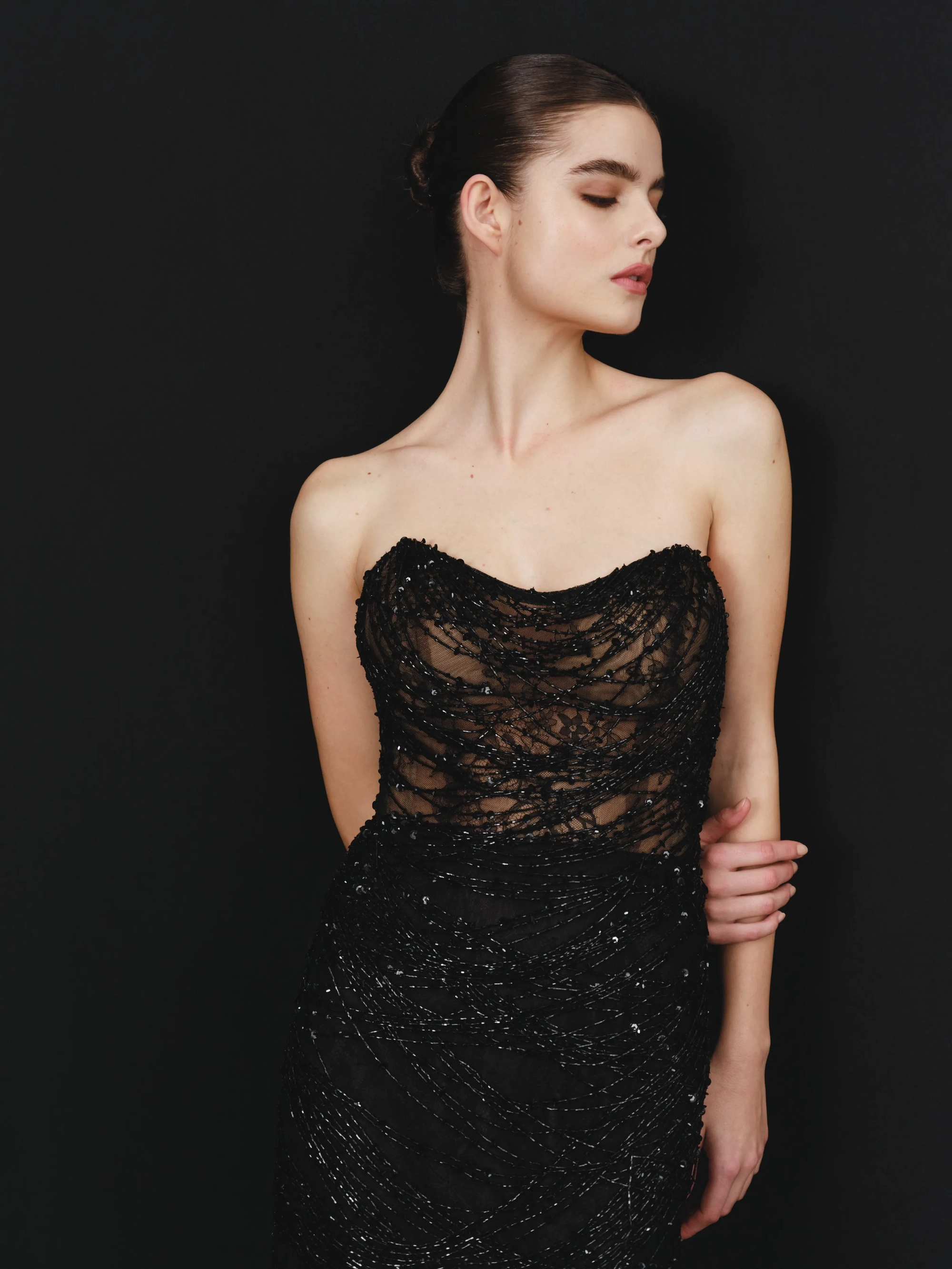 A strapless black mini dress with intricate shimmering details and form-fitting silhouette. Pair with strappy high heels for a bold, glamorous look.