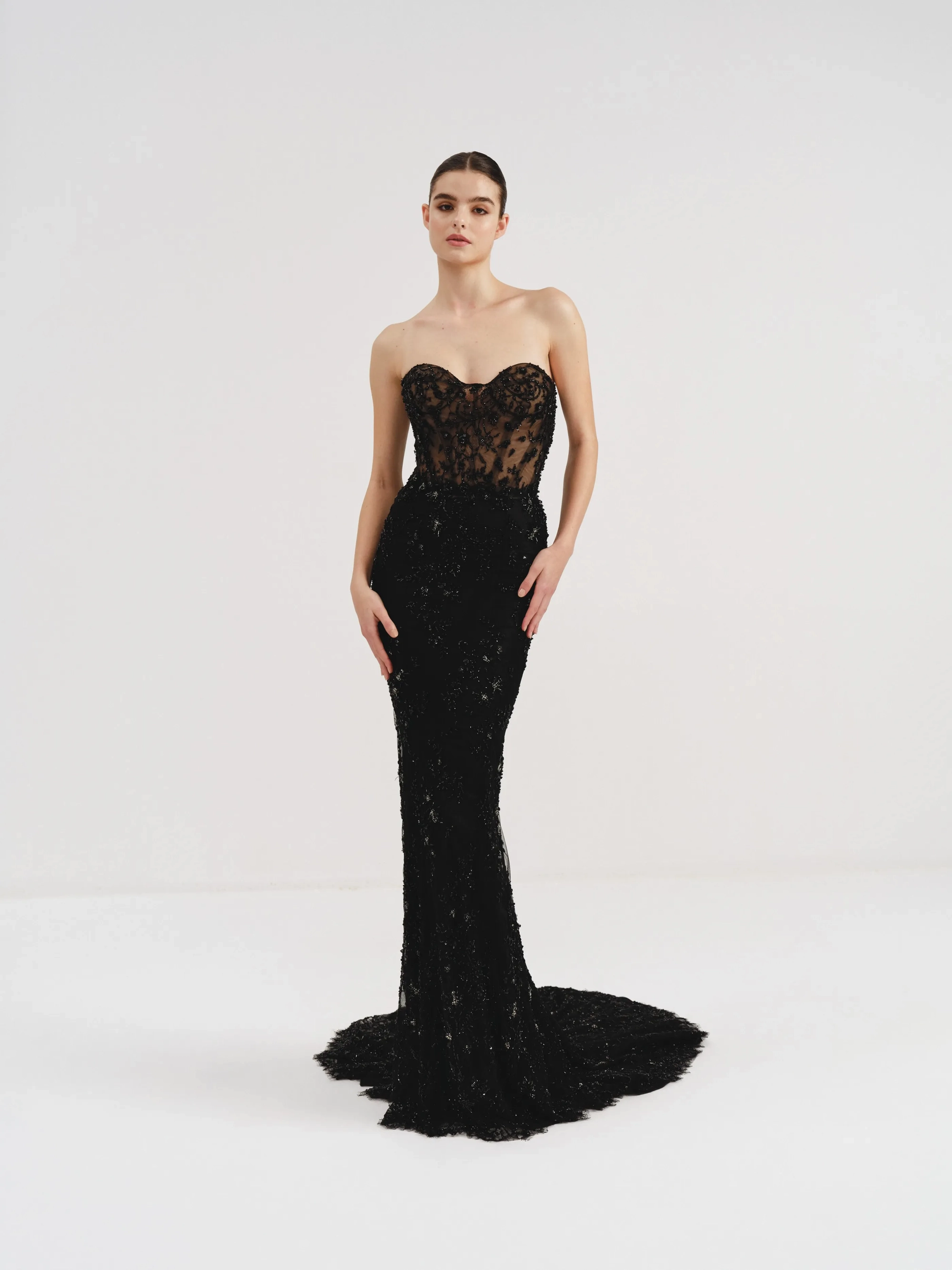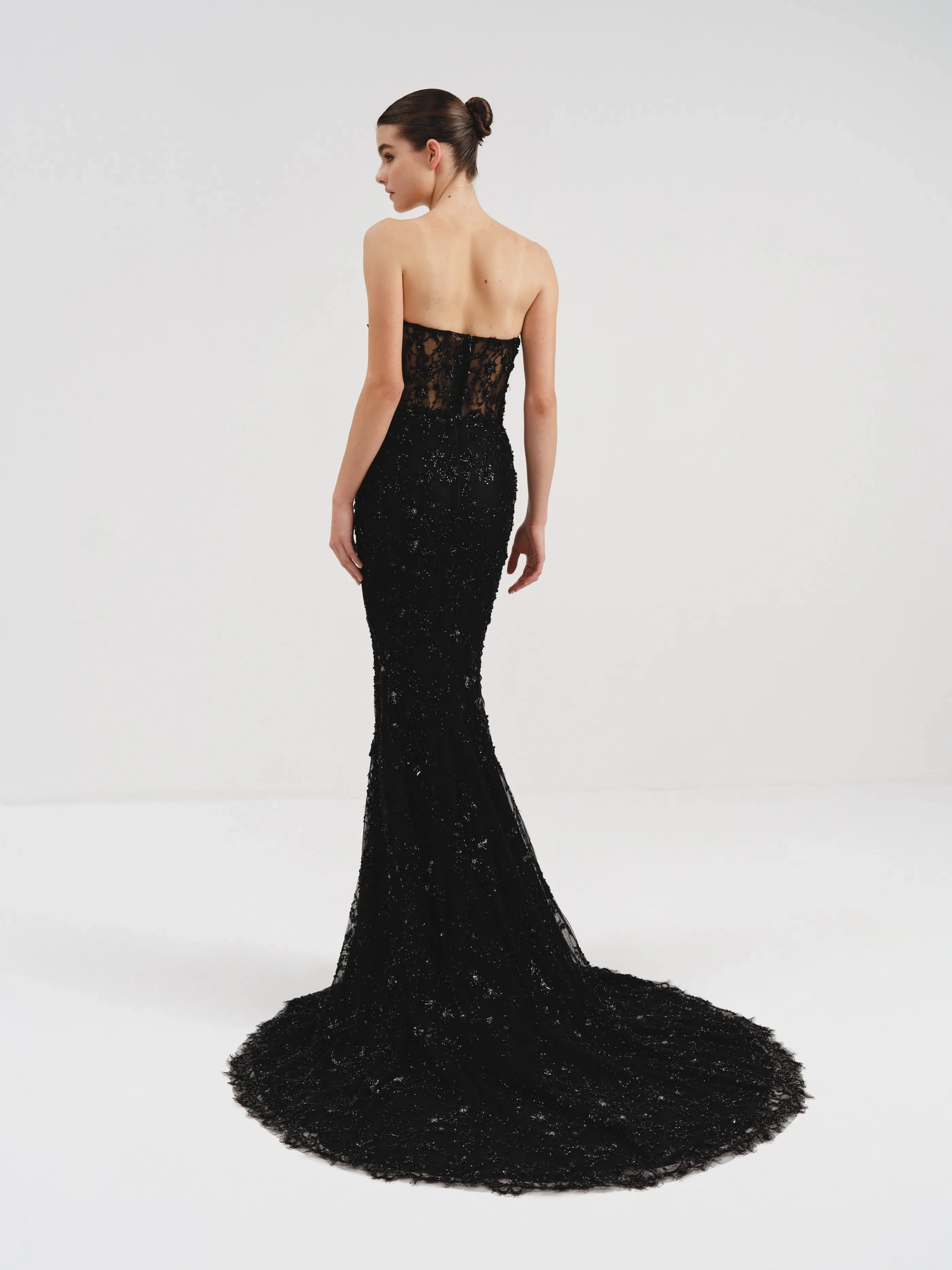The dress features a strapless sweetheart neckline with intricate black lace detailing and sparkling embellishments, exuding timeless elegance. Its fitted silhouette flows into a full-length skirt, creating a sophisticated and glamorous look perfect for formal occasions.