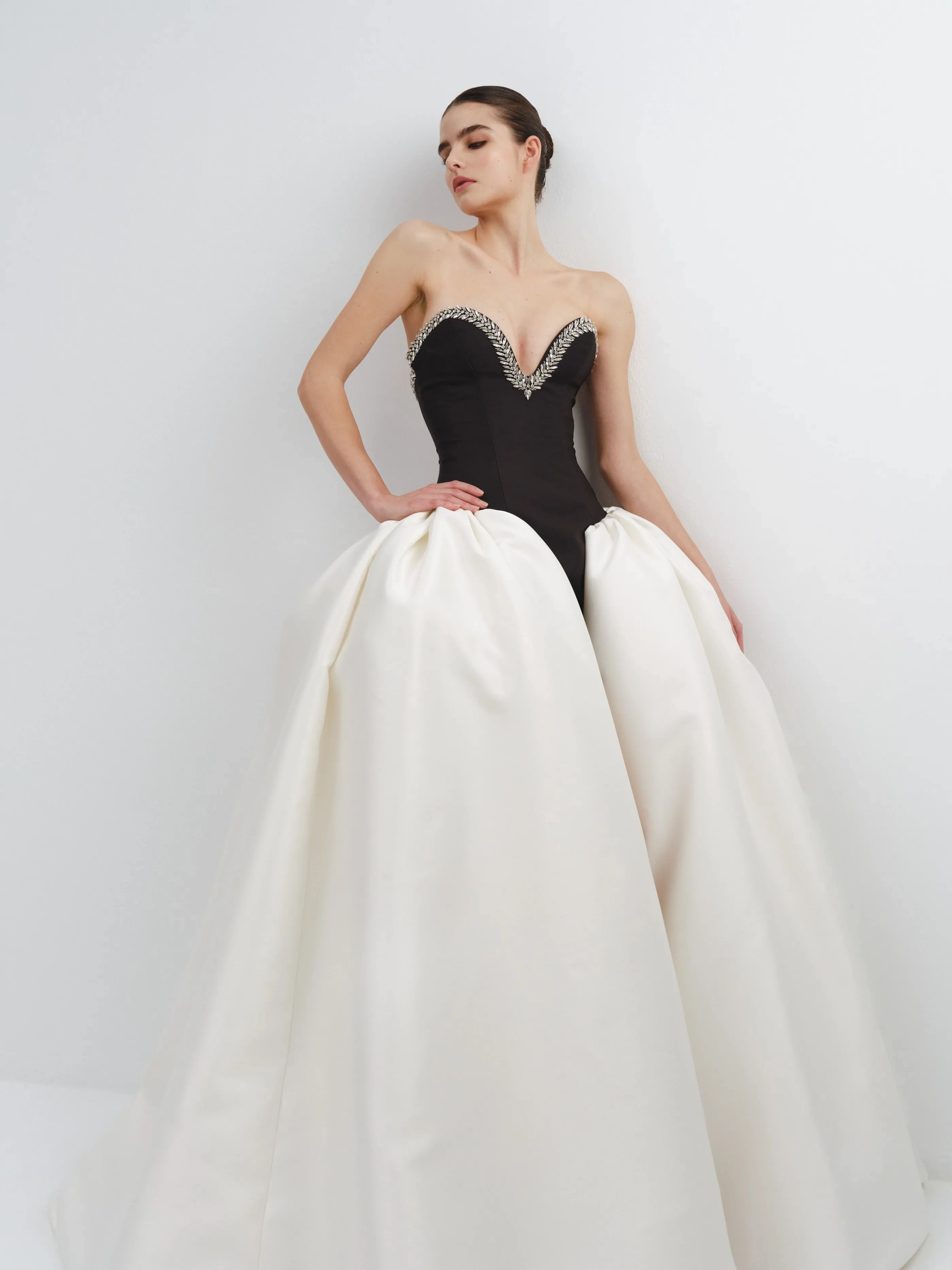 Strapless black dress with a crystal-embellished neckline, paired with a white overskirt for a bold, elegant look.