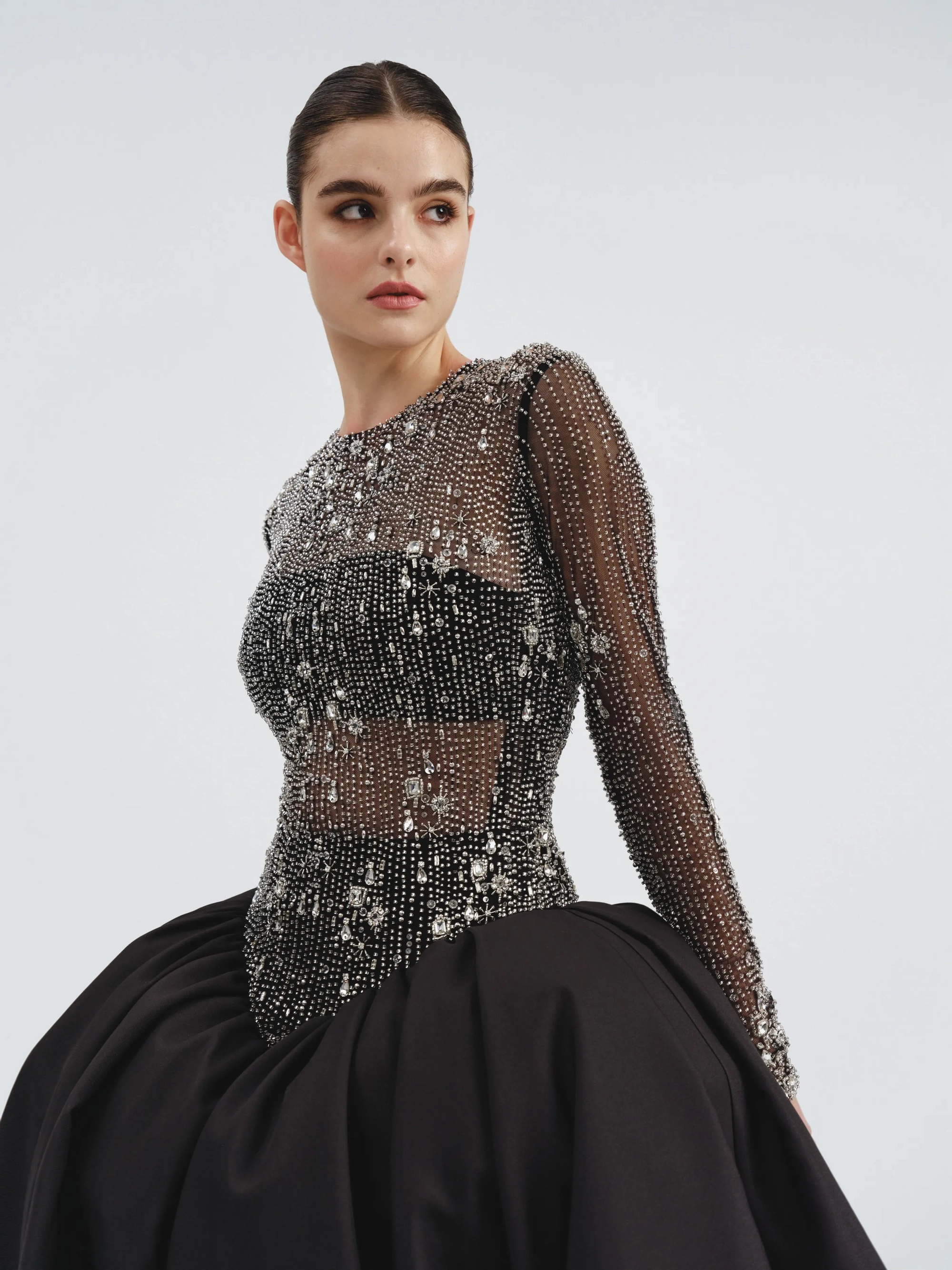 This ensemble features a long-sleeve intricately embellished bodice with a voluminous black ball gown skirt. The dramatic and regal silhouette is perfect for making an unforgettable statement.