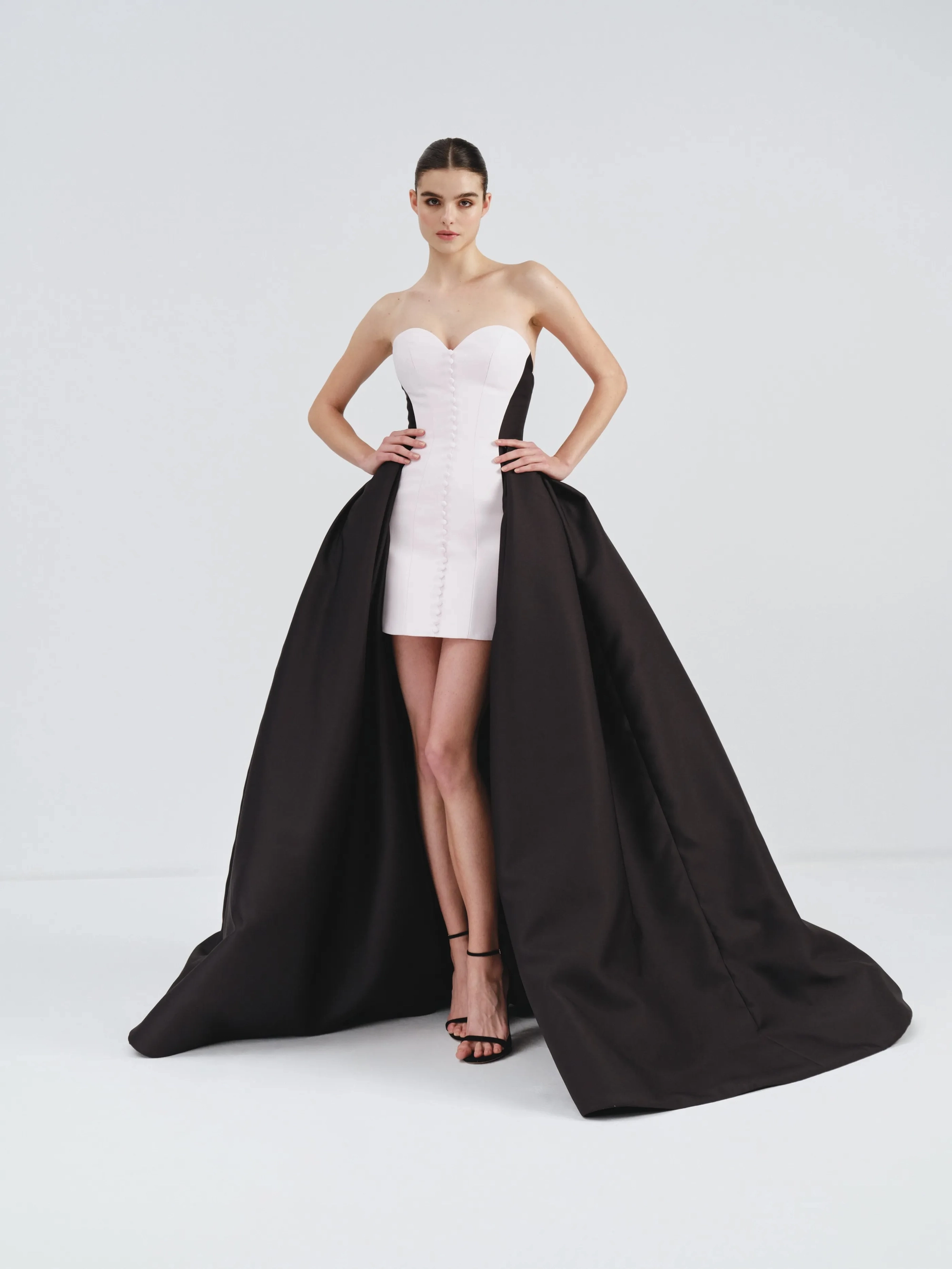 Adding the black overskirt creates a voluminous and floor-length silhouette. It contrasts with the fitted pale blush mini dress underneath, adding a striking dual-layer effect to the overall design.