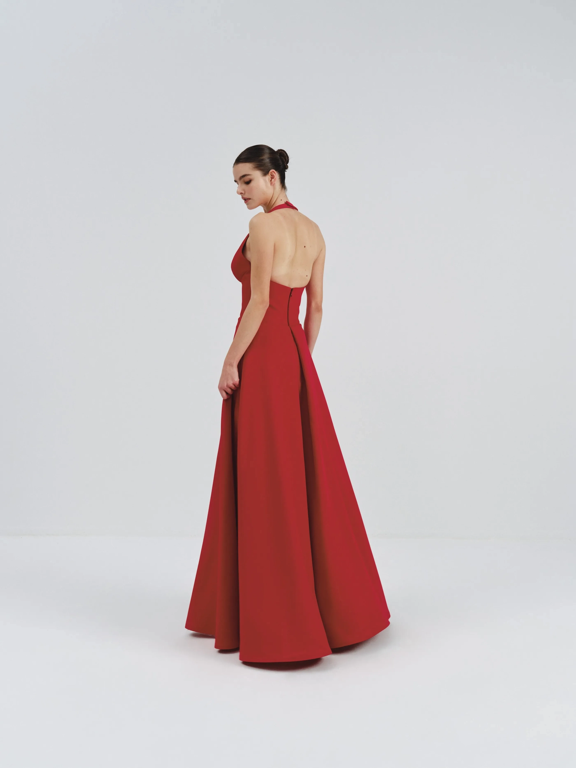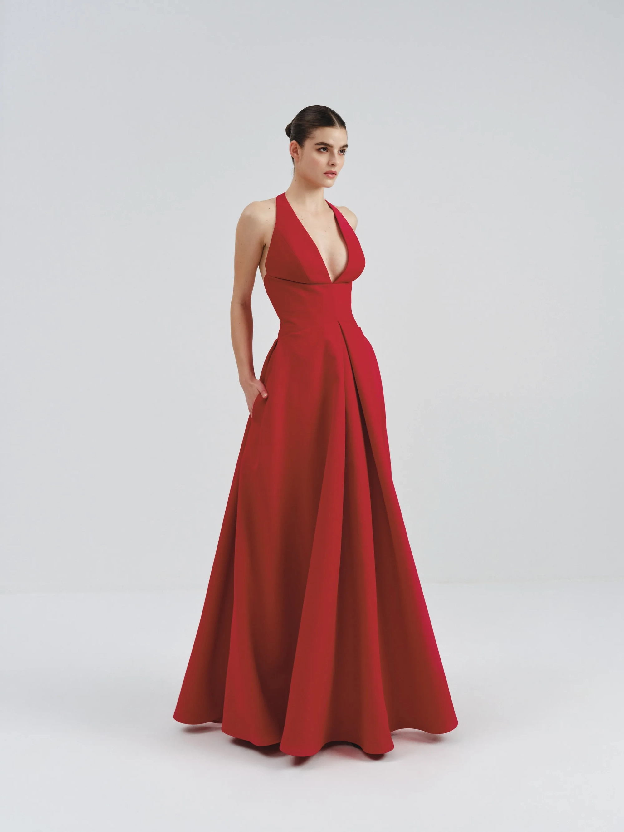 A vibrant red halter-neck dress featuring a plunging neckline and an open back. The fitted bodice flows into a full, floor-length skirt, exuding timeless elegance. Perfect for formal occasions.