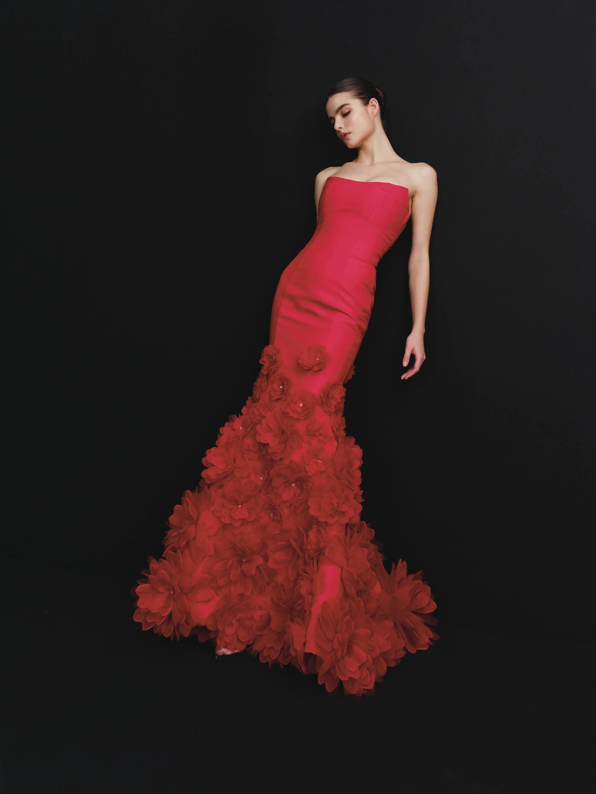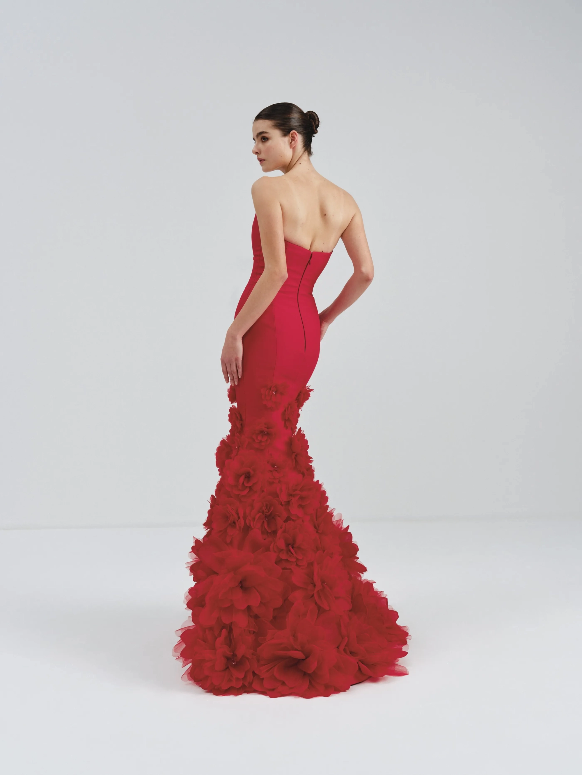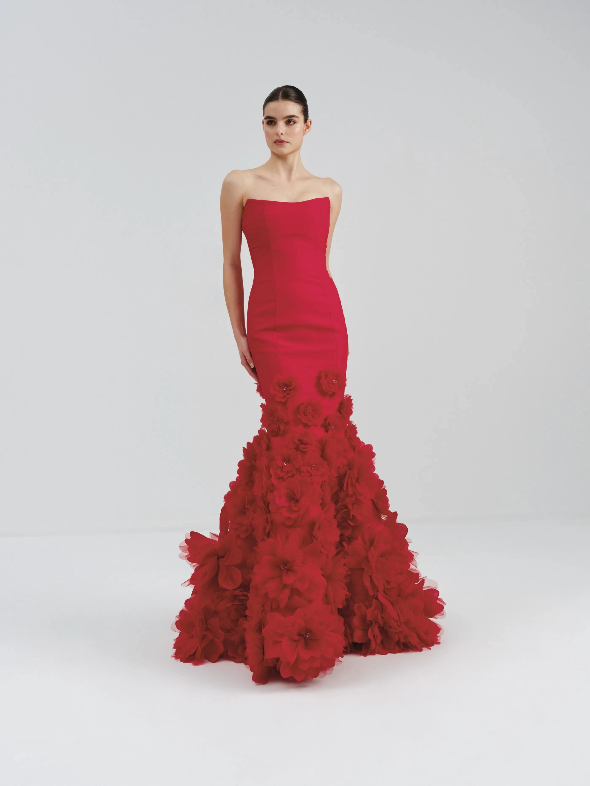 This breathtaking red gown features a bodycon silhouette and a mermaid skirt adorned with intricate floral appliqués. Perfect for special celebrations or black tie events.
