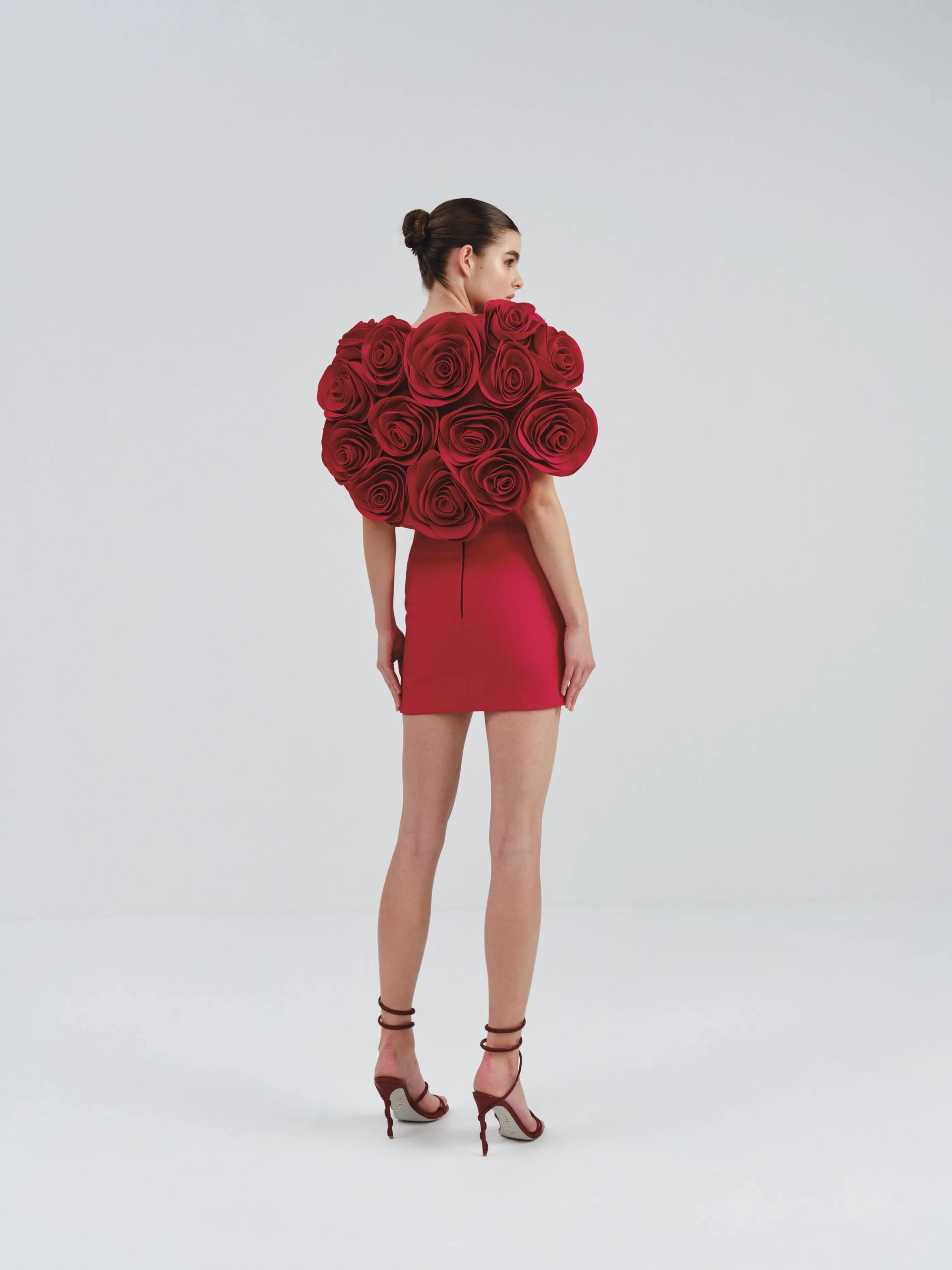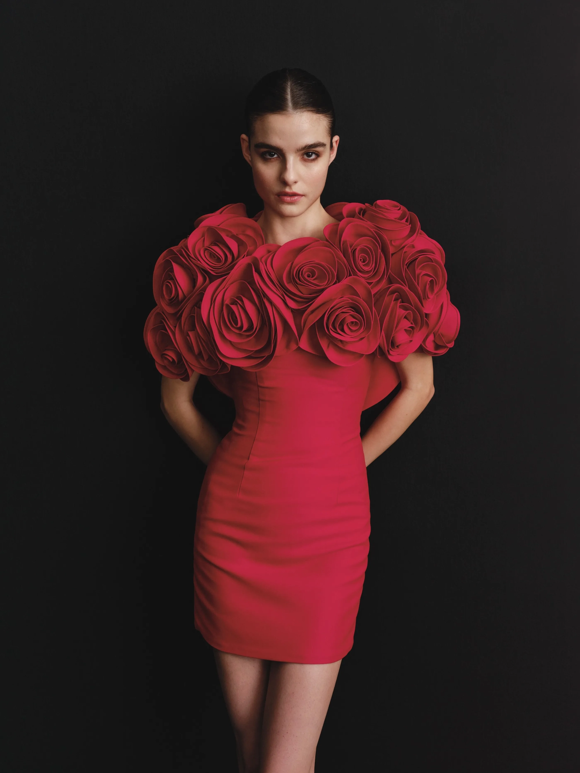 The outer piece is a dramatic jacket, adorned with vibrant red flowers that add a bold statement to the overall look.