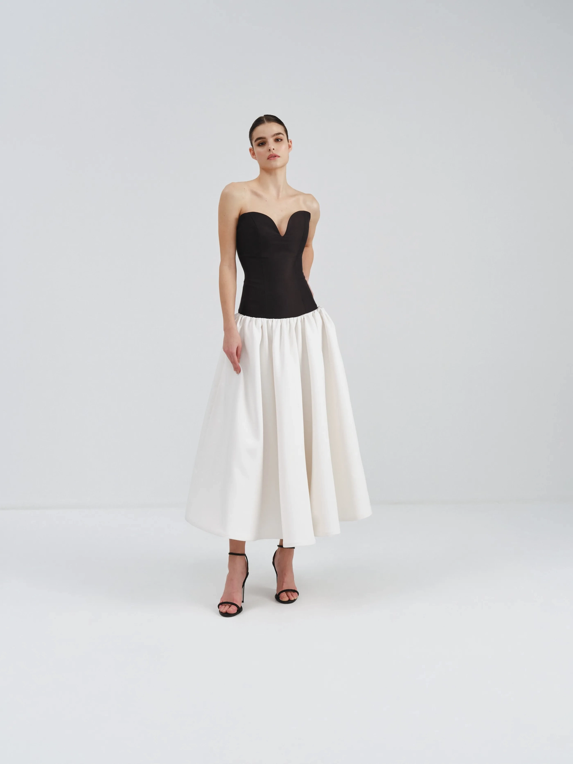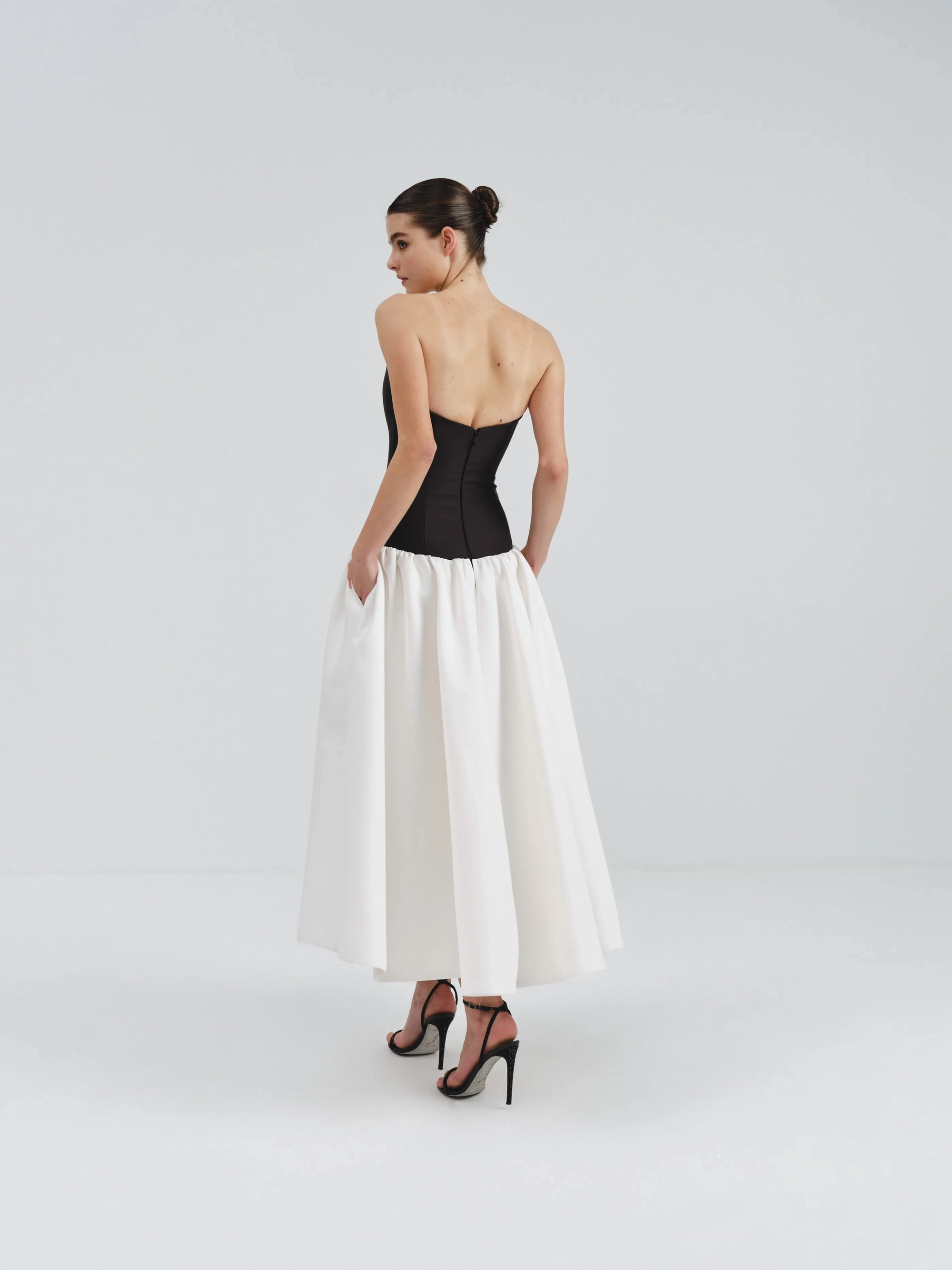 A strapless dress featuring a fitted black bodice with a sweetheart neckline, paired with a contrasting white midi skirt for a timeless look.