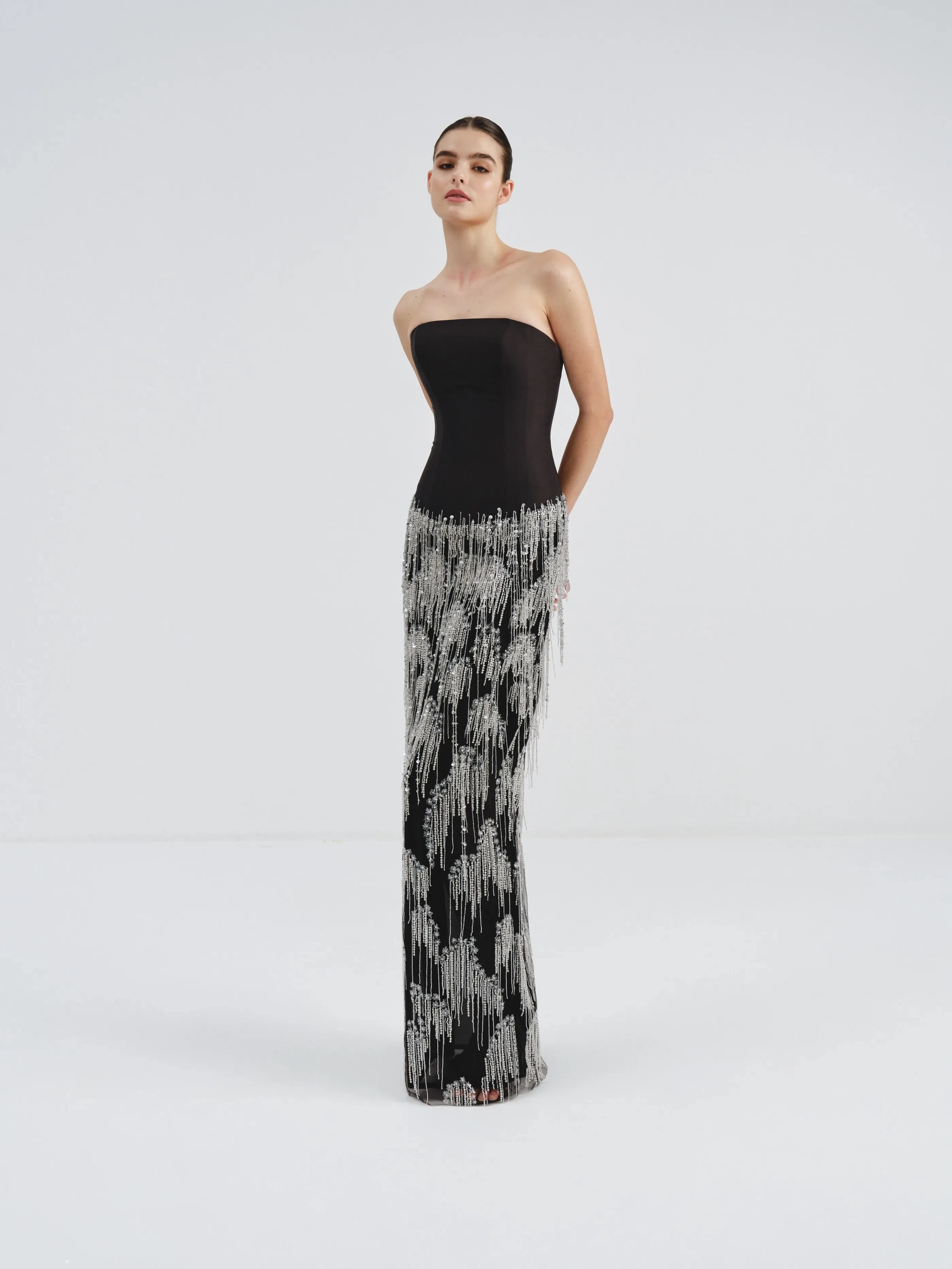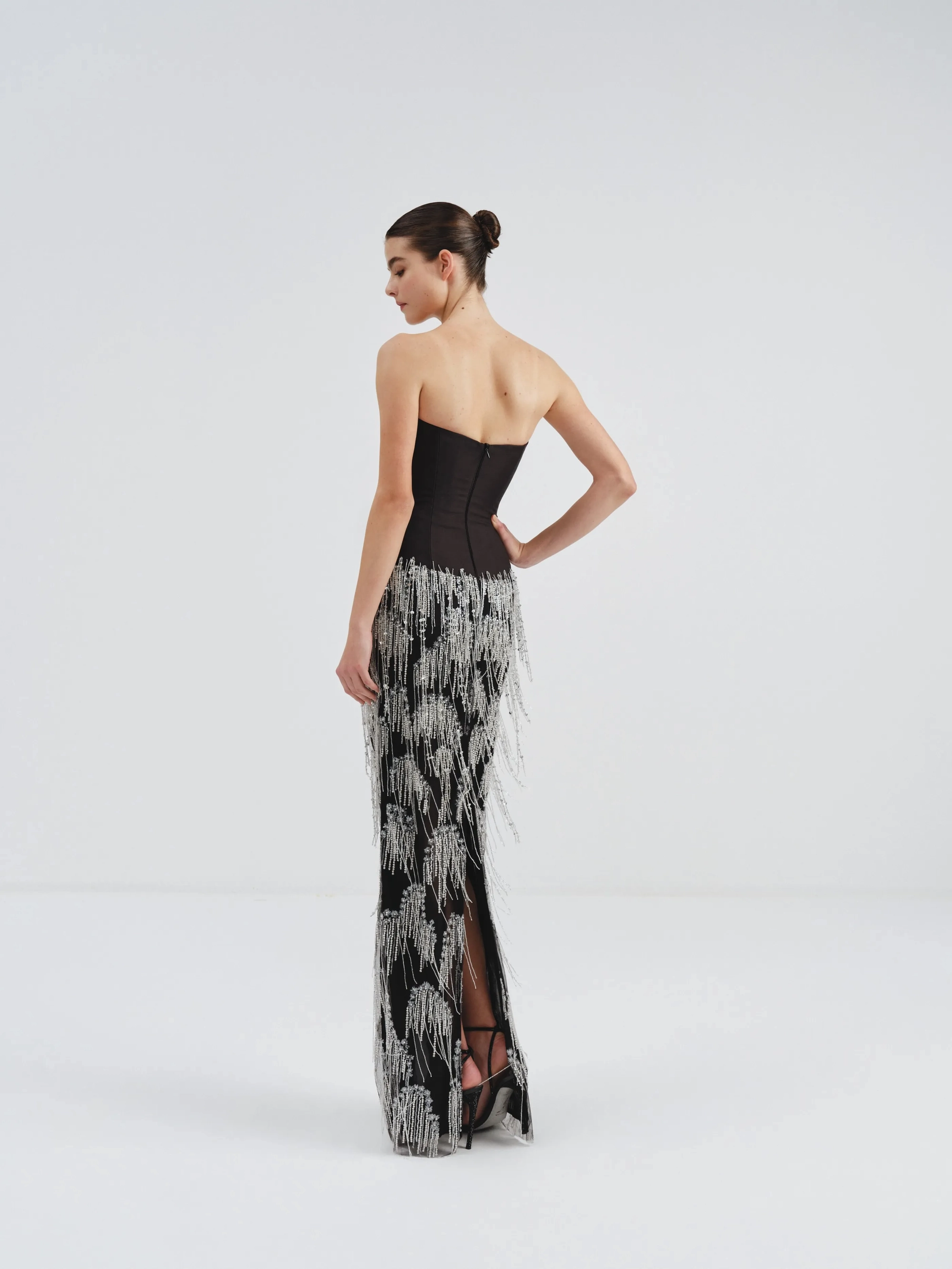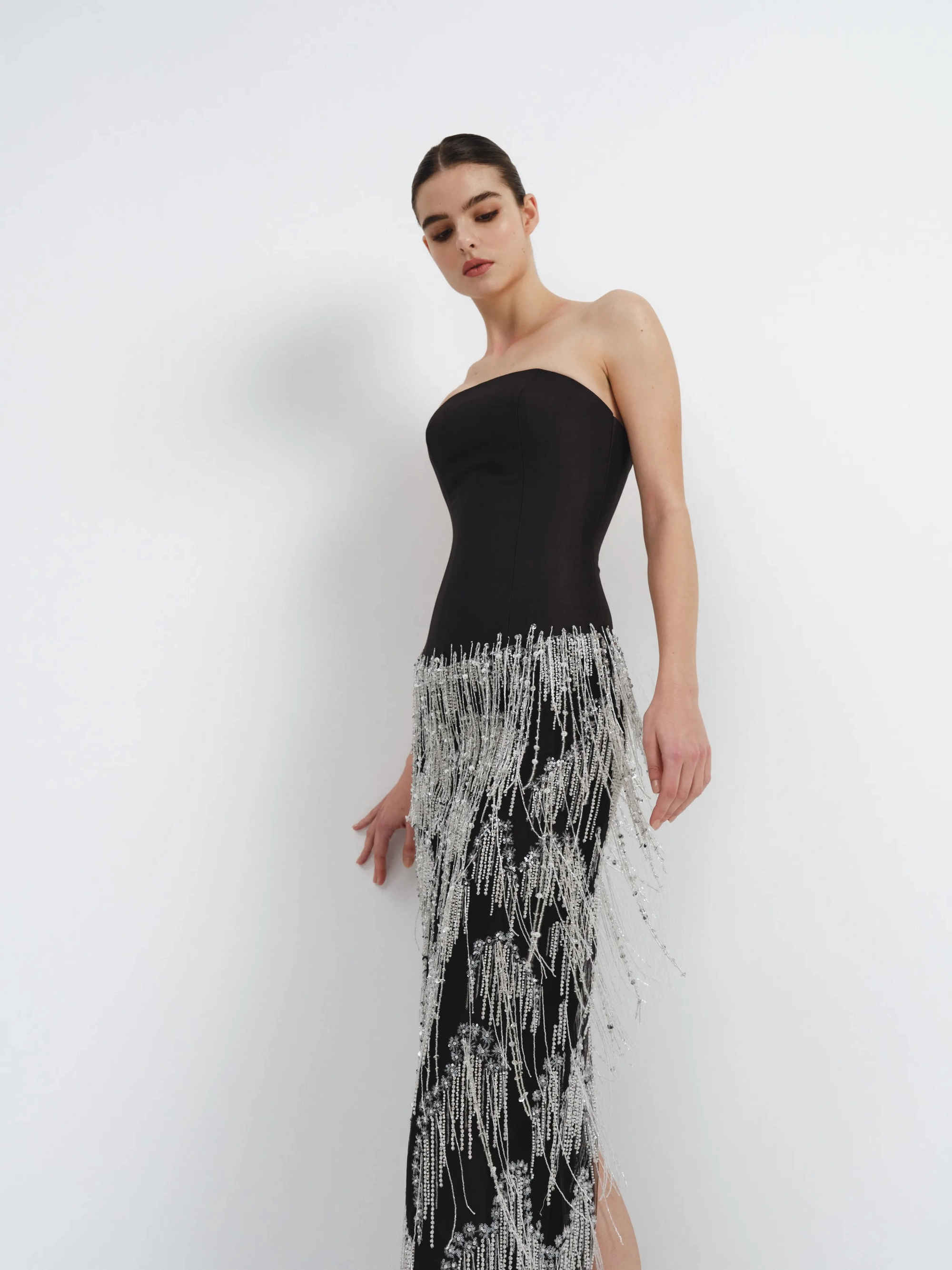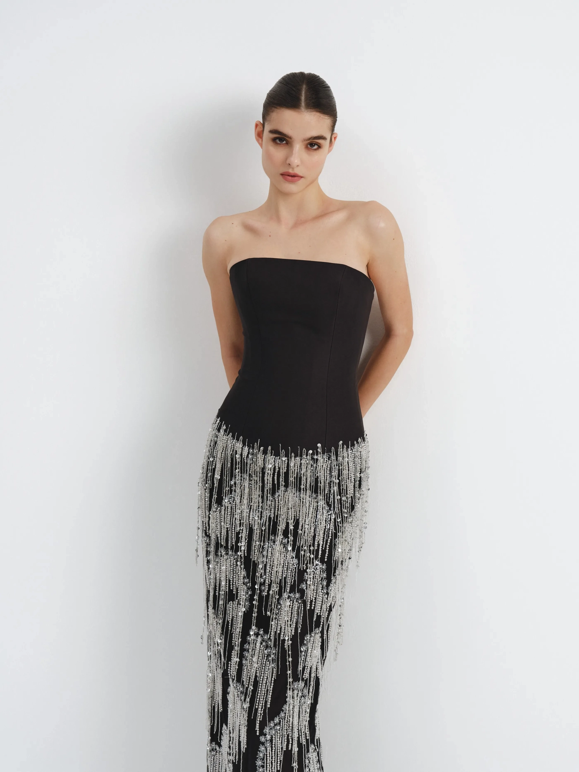 A strapless black dress with a fitted silhouette, adorned with cascading silver fringe detailing for a glamorous and sophisticated look. Perfect for formal occasions.