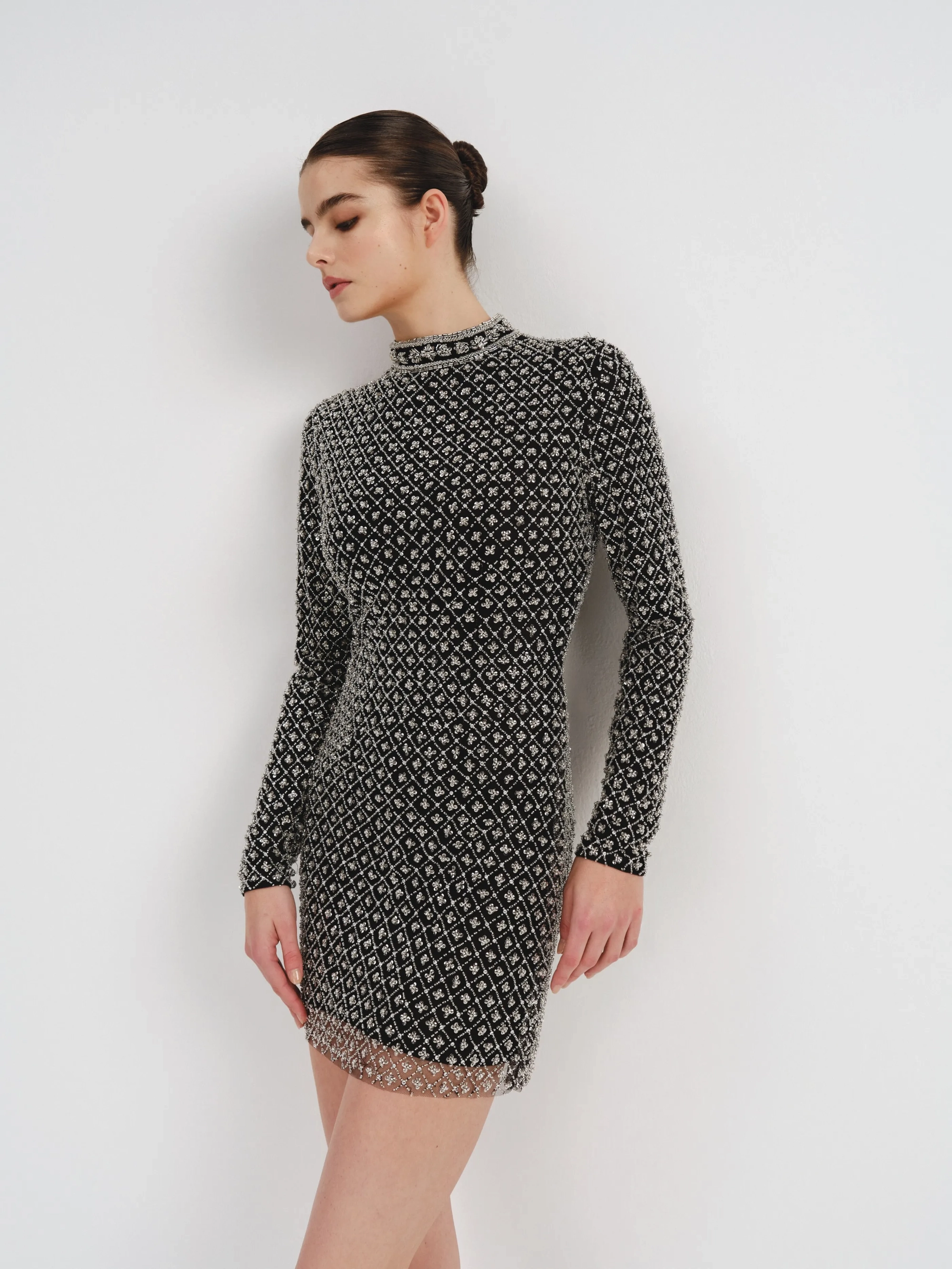 This dazzling mini dress offers a high-neck silhouette adorned with intricate geometric embellishments. Perfect for making a statement at evening events or parties.