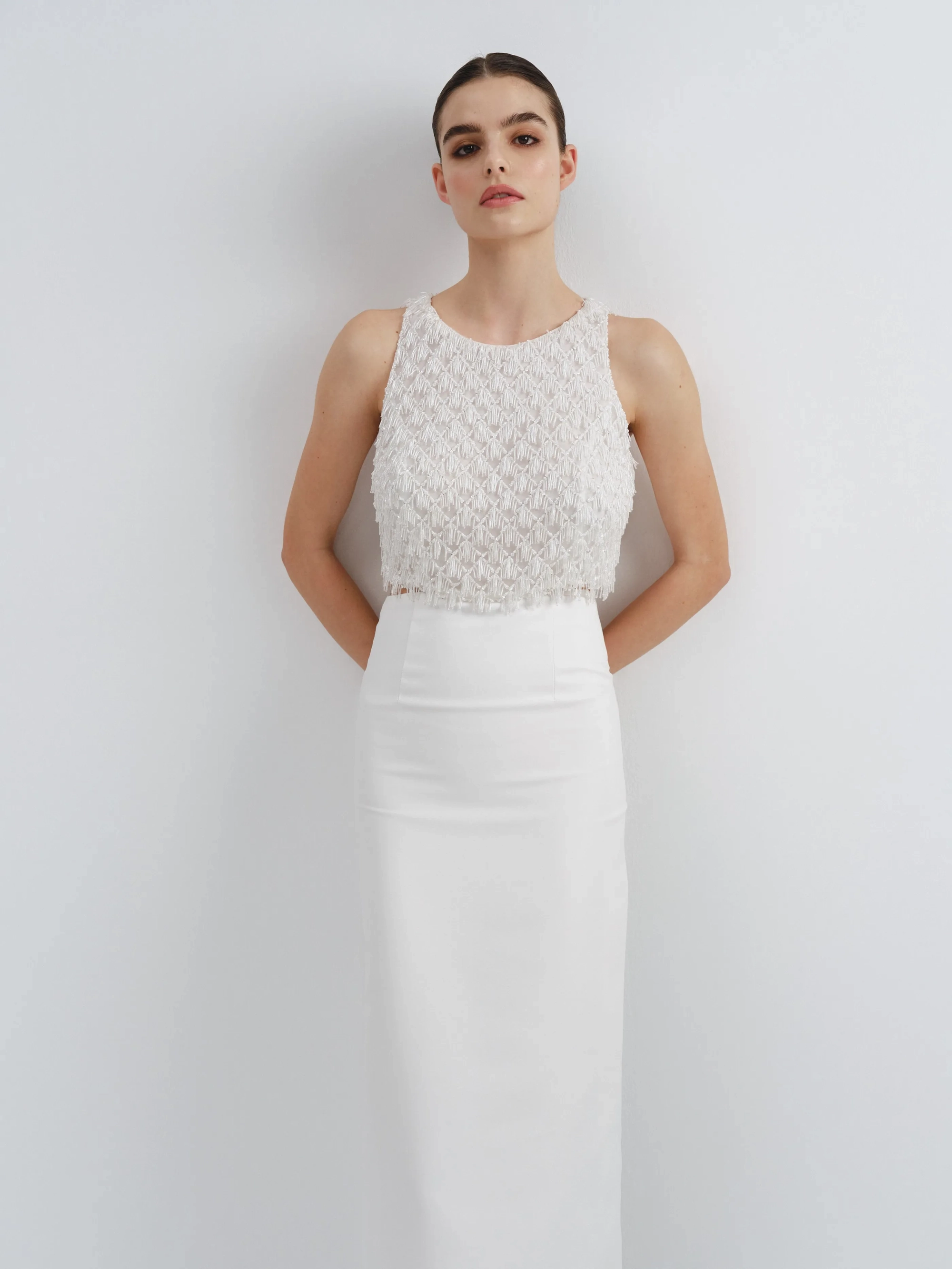 Embellished cropped tank top featuring intricate detailing, offering a refined yet contemporary aesthetic. The textured design adds dimension and charm, ideal for pairing with high-waisted separates.